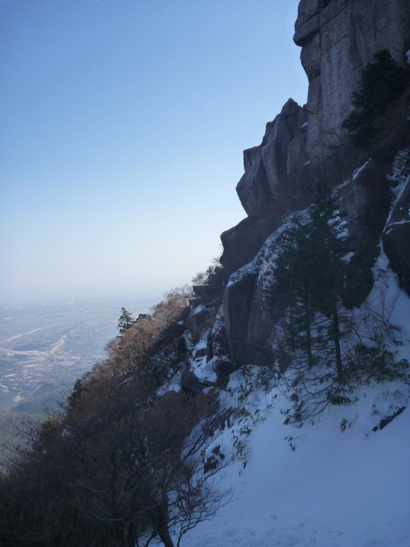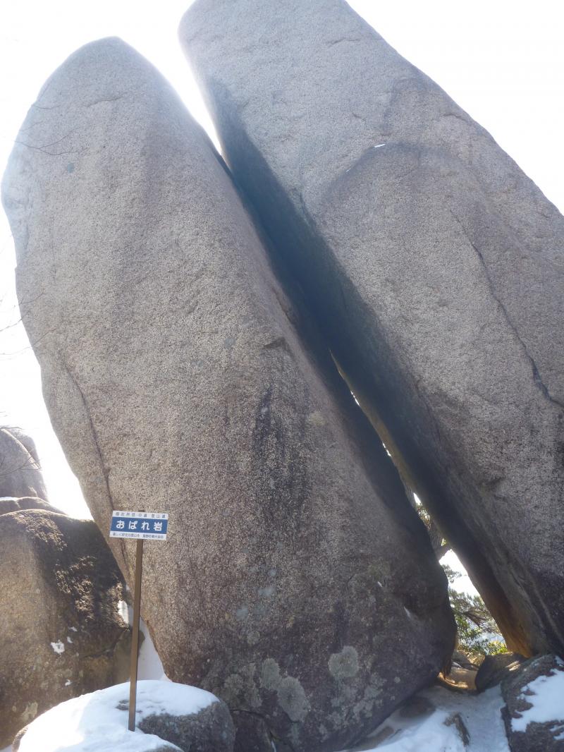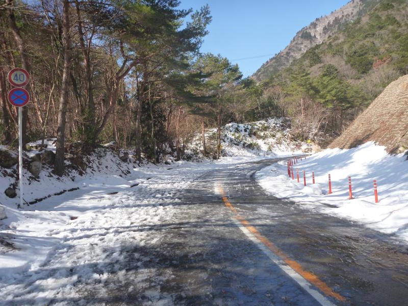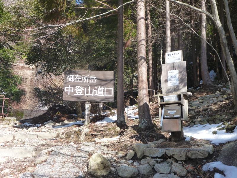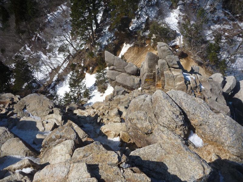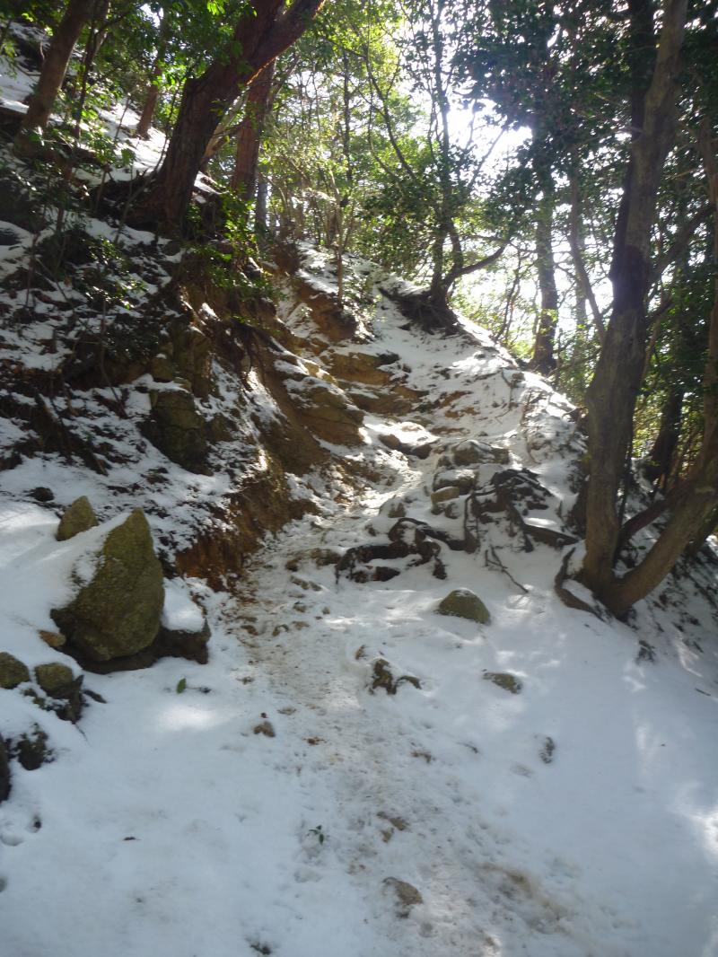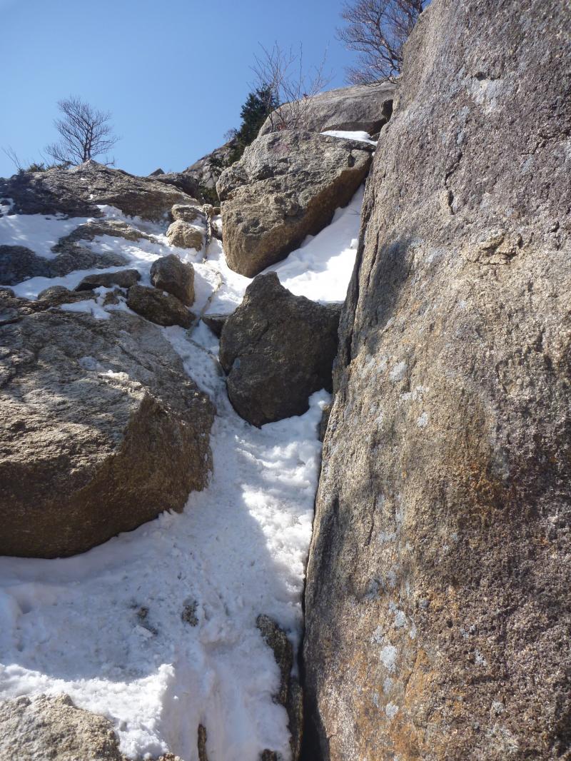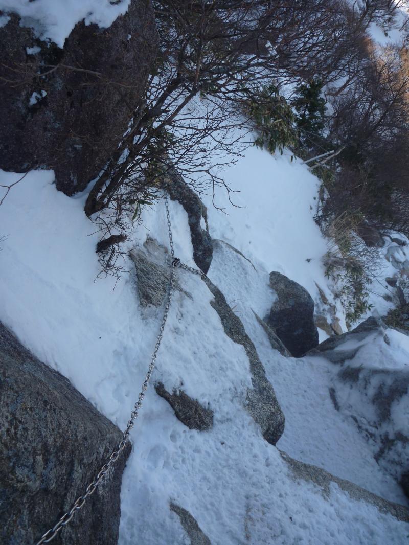 - 中道は、岩場が多く、雪道と雪のない岩場の繰り返しで、アイゼンの装着のタイミングを