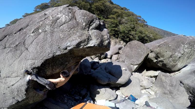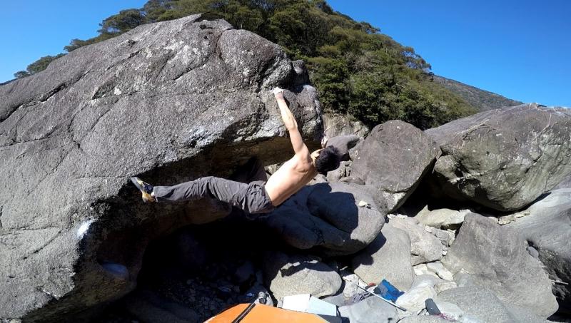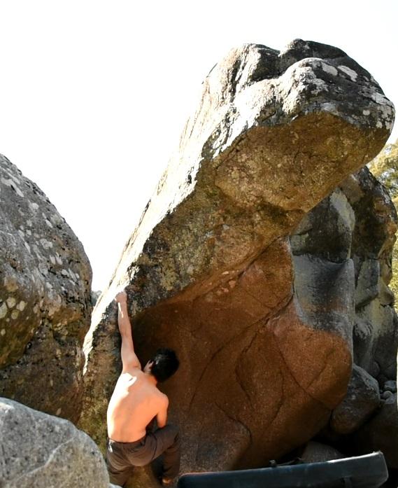 「恋人」は旅人とスタートは同じで左へと抜けていくルートです。ダイナミック且つ繊細なムーブの繰り返しでした。傾斜もルーフ状態に近く、下地はゴツゴツとしており、この恋人はなかなか手強かったです。しかし最後はこの恋人とも仲良くなり登ることができて幸せになりました。