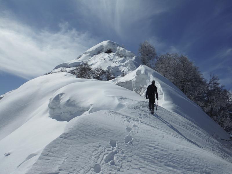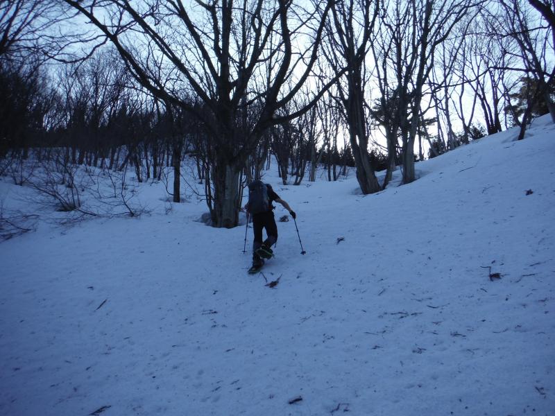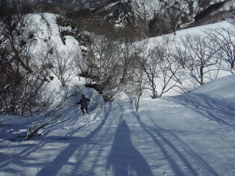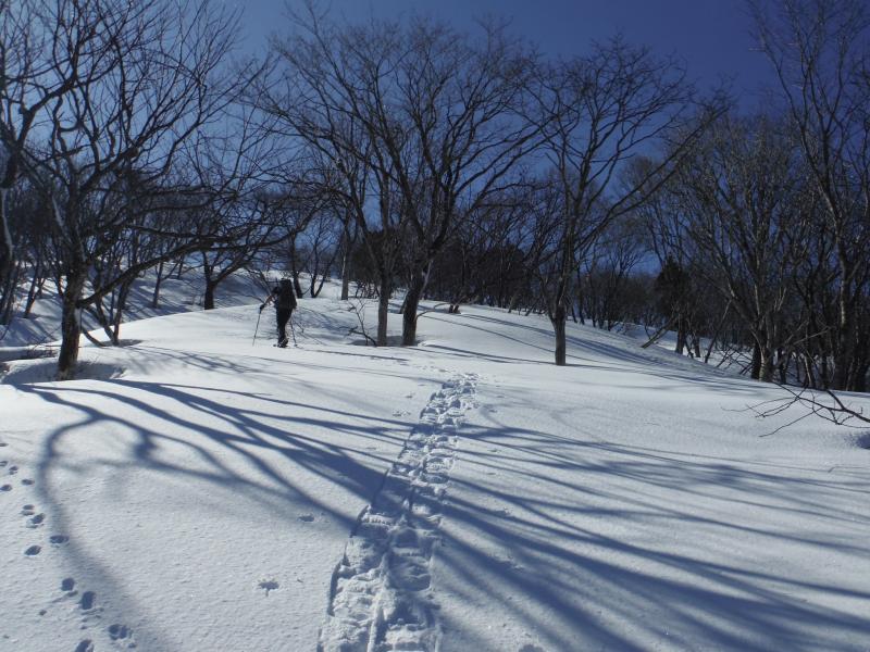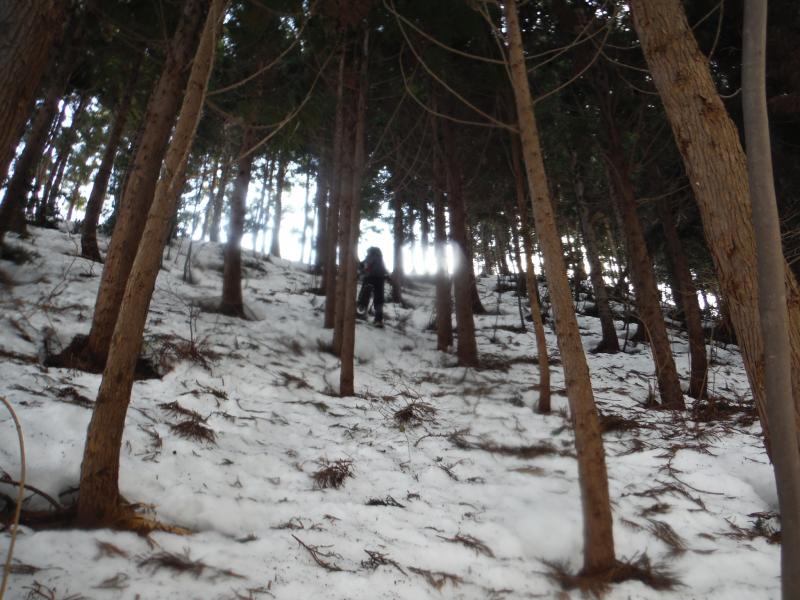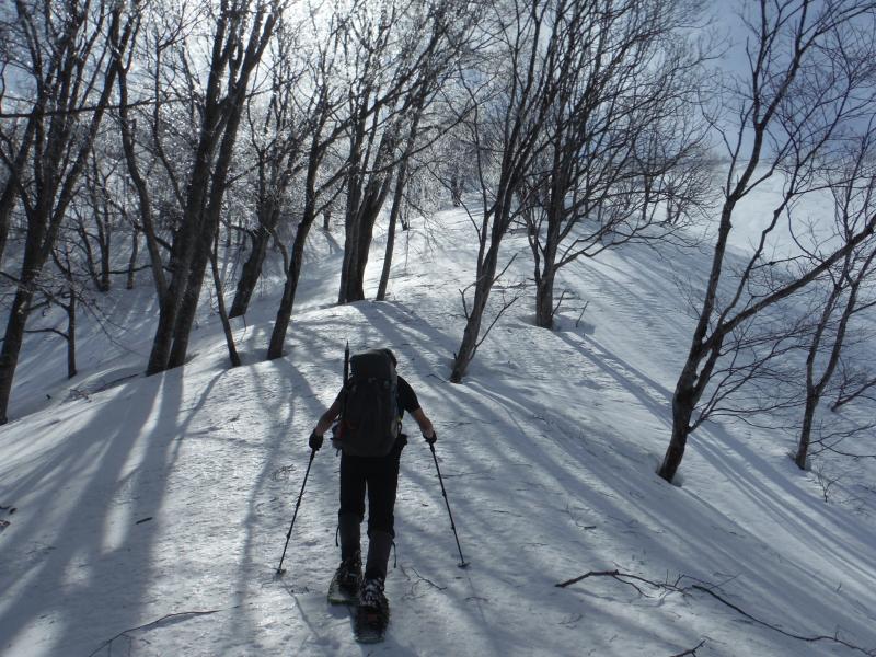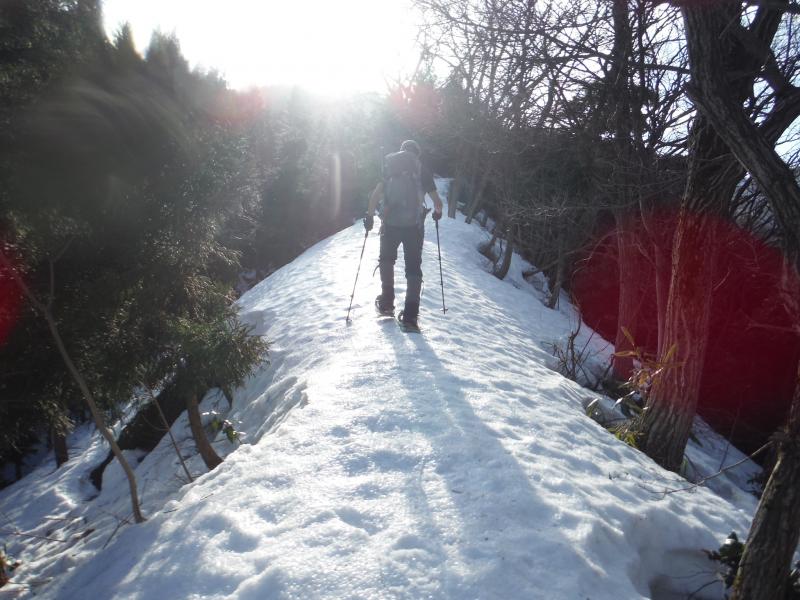 剣龍峡の見学は下山後にとっておいて、車道を何度かショートカットしながら登山道の尾根に取り付きます。この日は曇り予報でしたが、朝日が眩しいくらい足元の雪を照らし、気温も上昇、上着は夏用でしたが、鍔のあるハットにせずニット帽で来たことを早速後悔しました。厳冬期はとっくに終わっていたんですね。