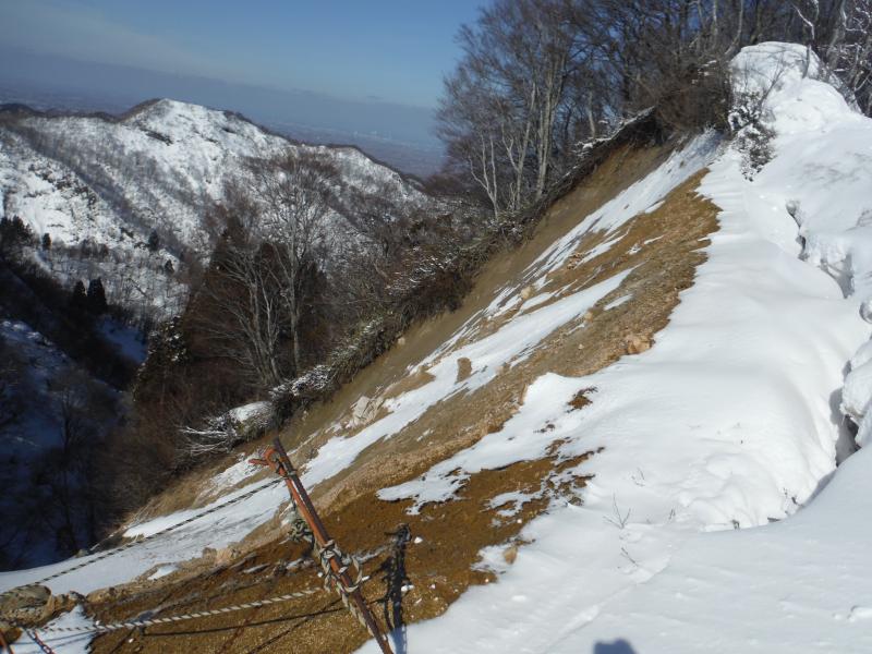 ・金鉢山の山頂手前は急登です。アイゼンがあると登下降が楽です。南峰の東側の雪庇は落ちかけていて危険な状態でした。