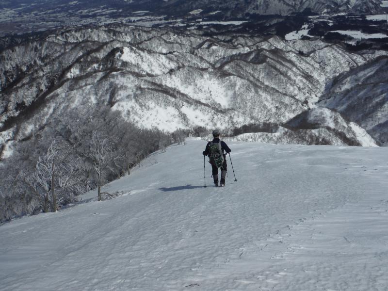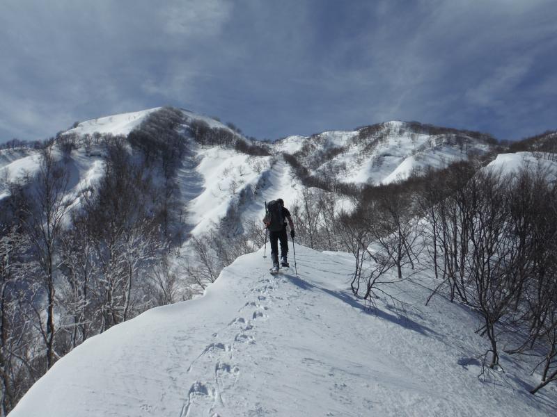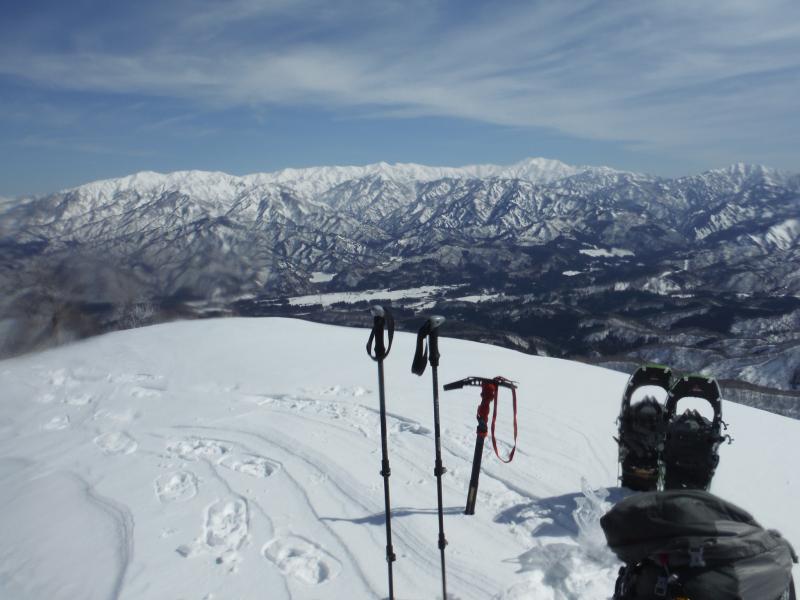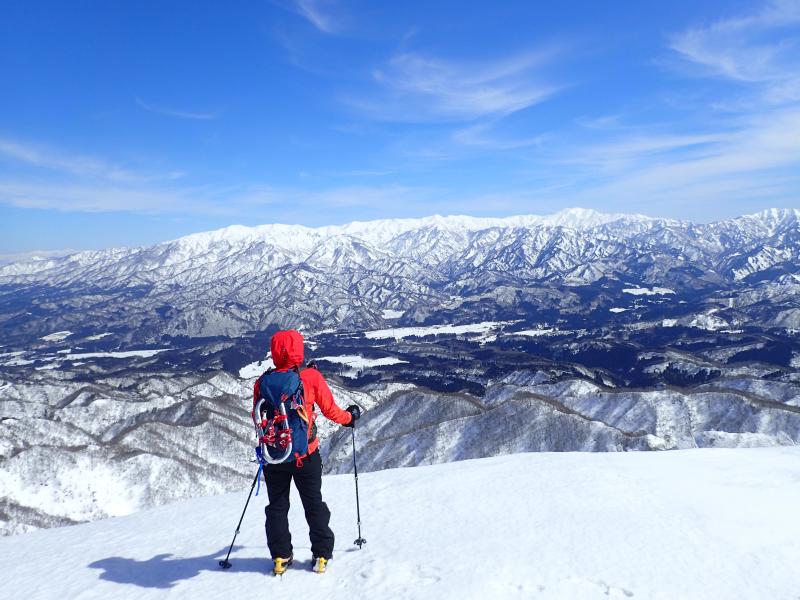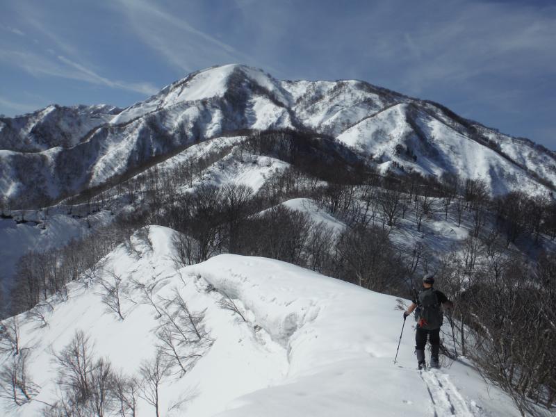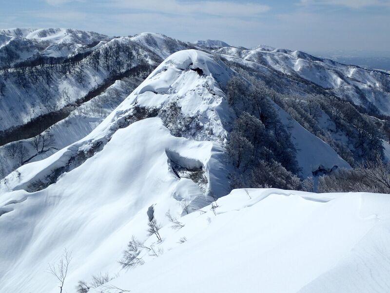 登るにつれ北東側の景色がみるみる開け、まだ白い二王子とさらに真っ白な飯豊連峰のパノラマが広がりました。一番奥には飯豊本山の三角もくっきり。しんどい登りでしたが青空と最高の景色を堪能できました。剣龍峡頂上のコマタに着いたら、下から見上げるとモンブランのような金鉢山をひたすら目指すだけ。途中までふかふかの雪だったのに傾斜が増すにつれ雪面がクラスト状に。私はワカンだったため、前爪が欲しいと思いながらハの字で食い込ませながら登りました。傾斜から解放されようやく地面が平らになって一安心。飯豊連峰と共に海側にくっきりと朝日連峰も連なっていました。青い空、白い峰々、文句なしのコンディションでしたが、山頂まで来て南峰を見た瞬間その不気味さに背筋がゾクッ。近づいてみたはものの、東側は雪庇が落ち山肌がえぐれかなり強面。ルートは西側の斜面ですが、まだたっぷりと雪が付きしかも恐ろしく急。登れたとしても戻るのはかなりリスキー。戦意喪失し直ちに引き返しました。状態を見極められるようになって、尚且つ片道切符で縦走する機会があるときにもう一度リベンジしたいです。