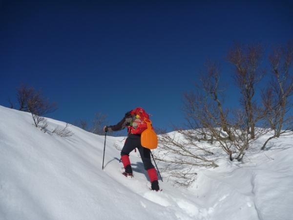 荒菅沢を横断し、これまた急斜面を登って尾根に上がりしばらくすると、シールもクトーもつぼ足も効かないようなハードバーンになり、ここでアイゼンを装着。