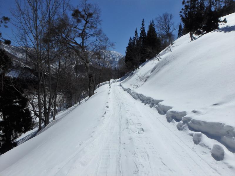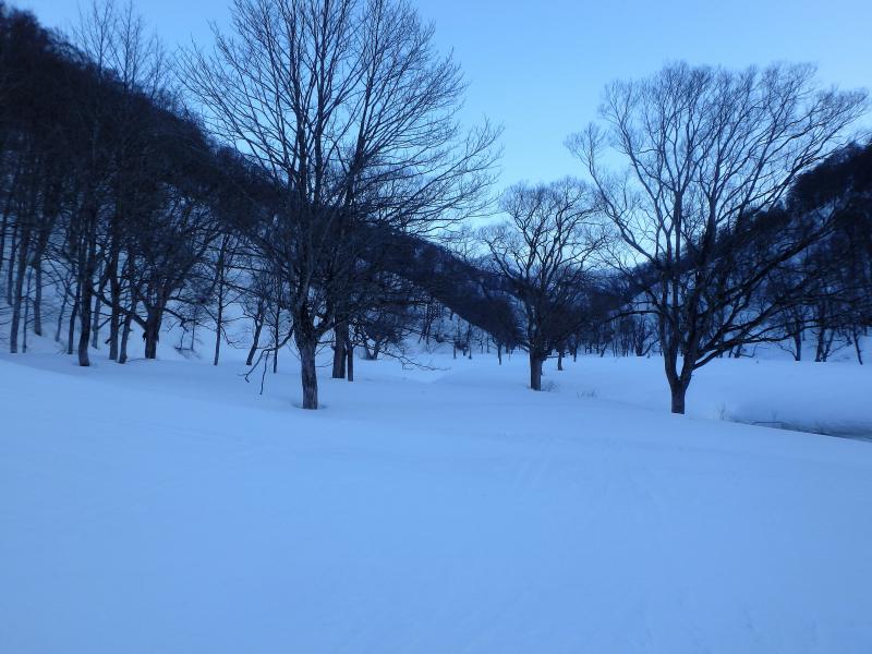 荒菅沢を大海川まで落とすという手もありましたが、朝の段階で大海川の雪の付きがあまり良い印象ではなかったので、途中からP2方面へトラバースしてキャンプ場まで戻りました。