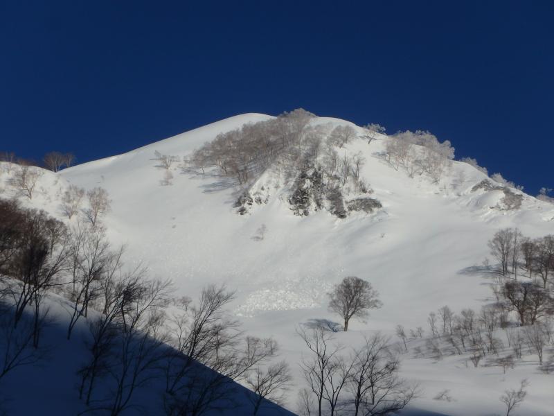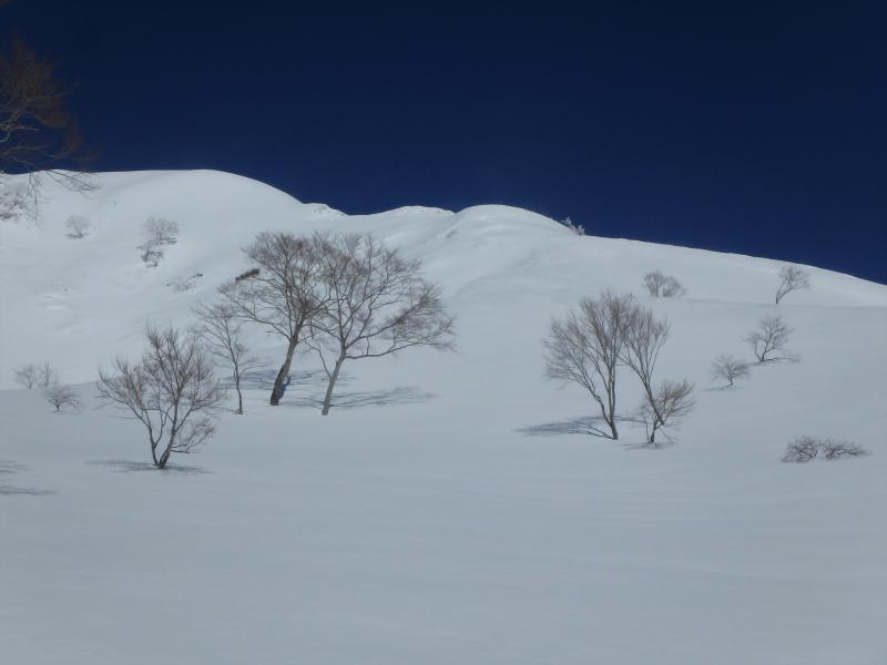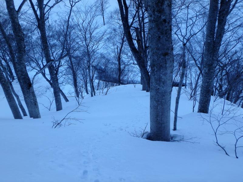 雪質とルート取りにもよりますが、登山口から山頂までは急斜面と緩斜面が交互に続くので、シールとつぼ足の切り替えが面倒です。