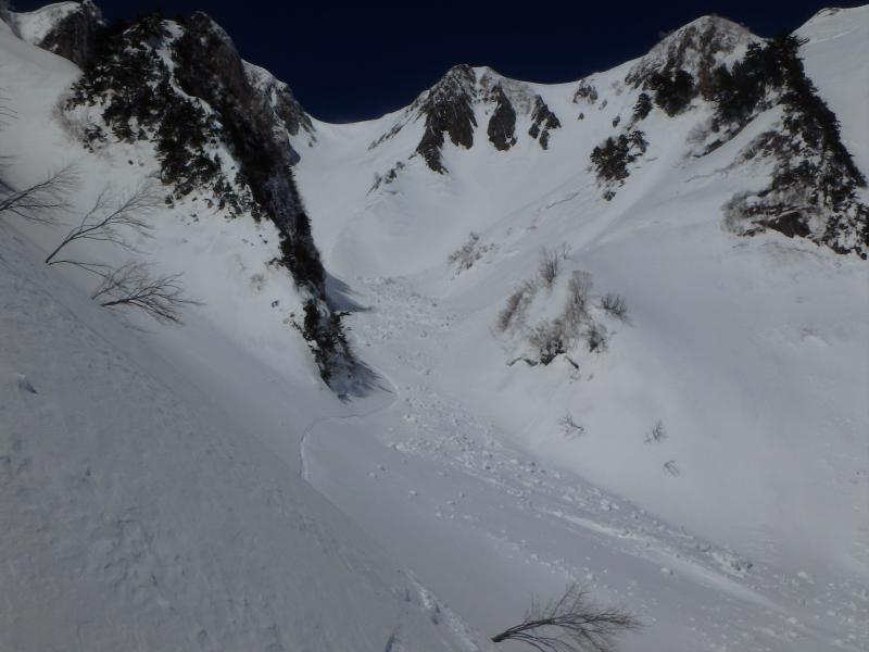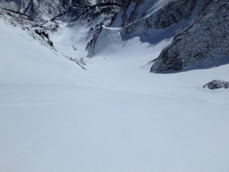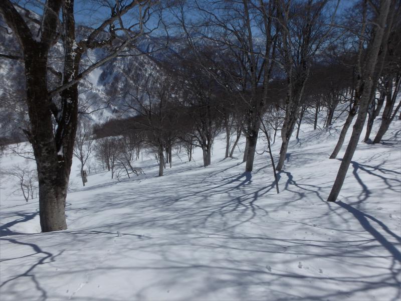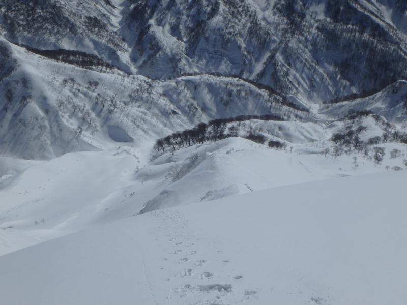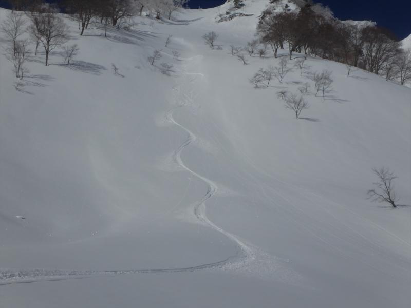 山頂からはクラストしていない斜面を選んで滑り降り、荒菅沢へ入ります。
