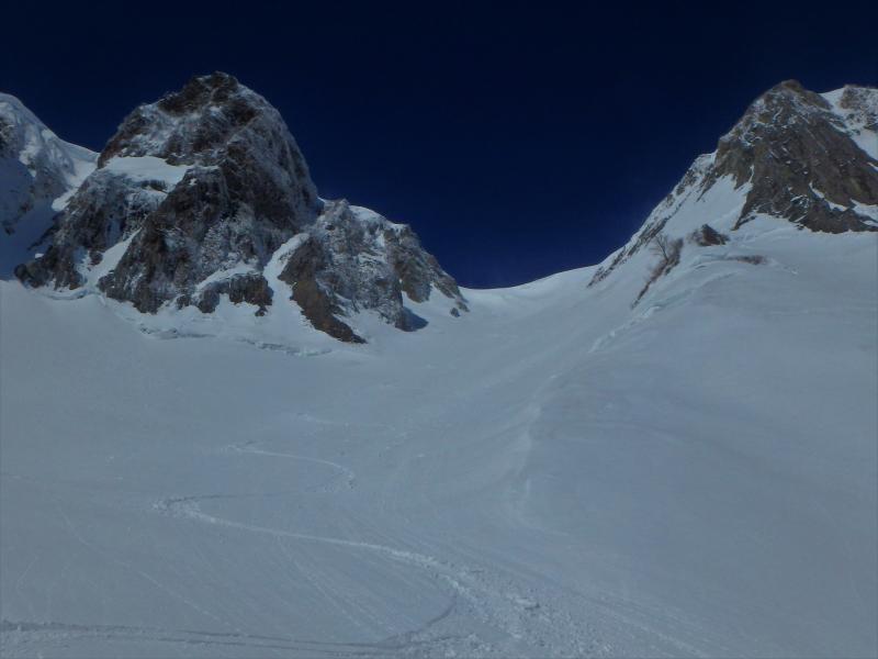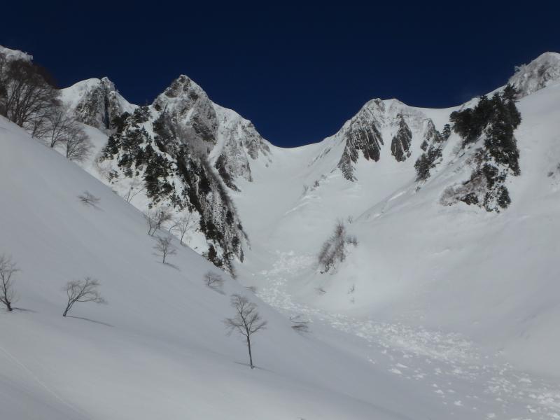 途中デブリもありましたが、振り返ると布団菱と荒菅沢の滑走ラインのコントラストが見事でした。