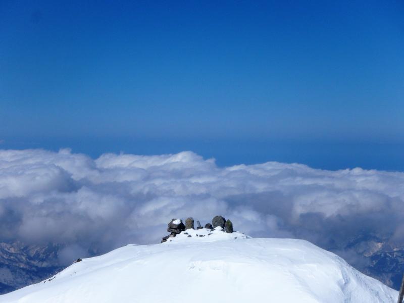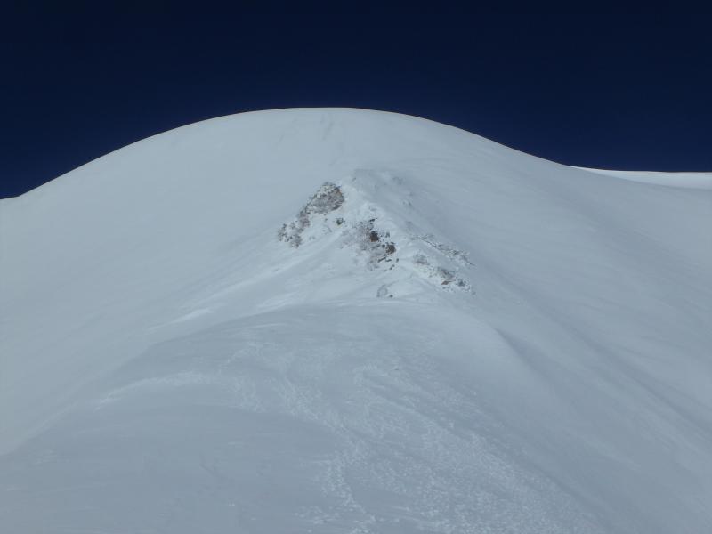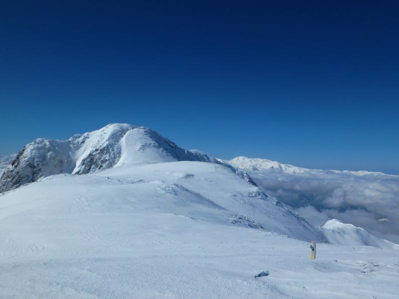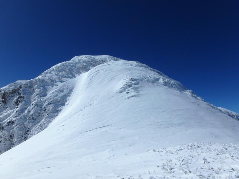 ここまできたら山頂はすぐそこ。笹平から眺める山頂へのルートは厳つい雪壁のように見えますが、意外と登りやすく早く着きます。