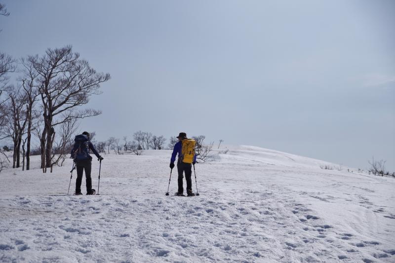 リフトを降りると、雪がまだまだ多かったのですぐにスノーシューを装着しましたが、いきなりまあまあ斜度がある上りをひいこら言いながら開けた尾根に出ました。