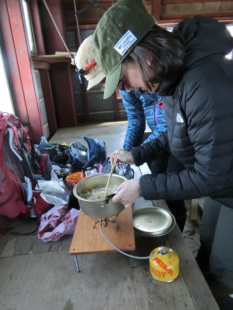 山頂避難小屋はすでに先行者が休憩中でしたが、何人かがちょうど出発したので、空いた所で友人がめちゃウマ鍋を作ってくれました。すべて友人が準備してくれていたので、今回の昼食は楽させてもらい、具沢山の鍋を食べて、満足満足(´▽`)