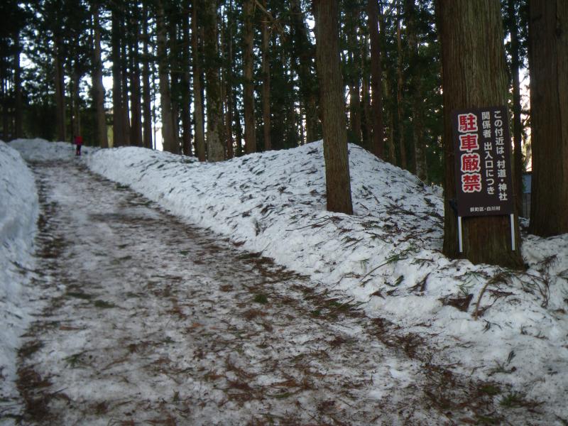 ②登山口はまずは明善寺を目指し、「合掌民宿久松」合掌民宿・ふるさと」の横の道を行くと、しばらくで除雪が終わっています。左上に雪で埋まった林道があり、そこを行きます。