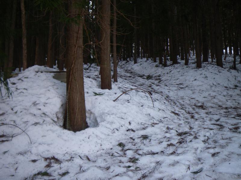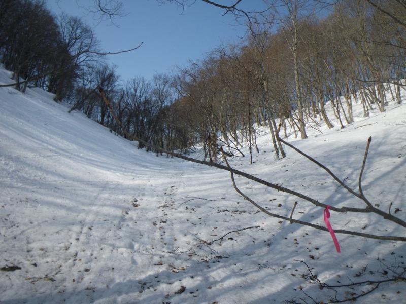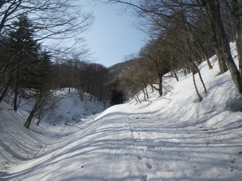 ⑤宮谷林道合流点から林道をしばらく行き、右手の尾根に取り付きますが、林道がカーブするマーキングのある地点が優しい感じです。ちなみに林道を進み、宮谷沿いに進むと帰雲山手前に出るというコースもありますが、スキーヤー他にはあまり行かないようでトレースは少ない様子。