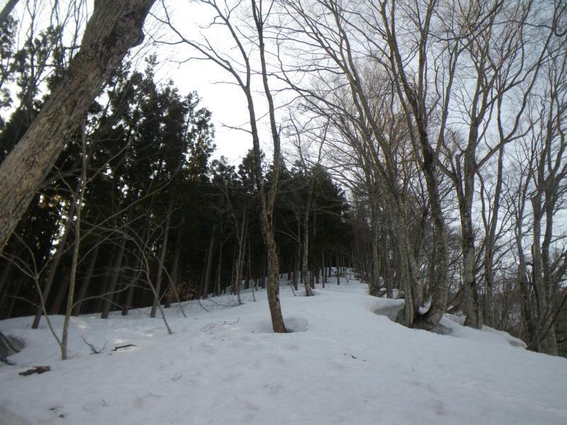 ⑥尾根に取り付き、やや急斜面にかかる箇所が凍結しアイゼンが欲しいところです