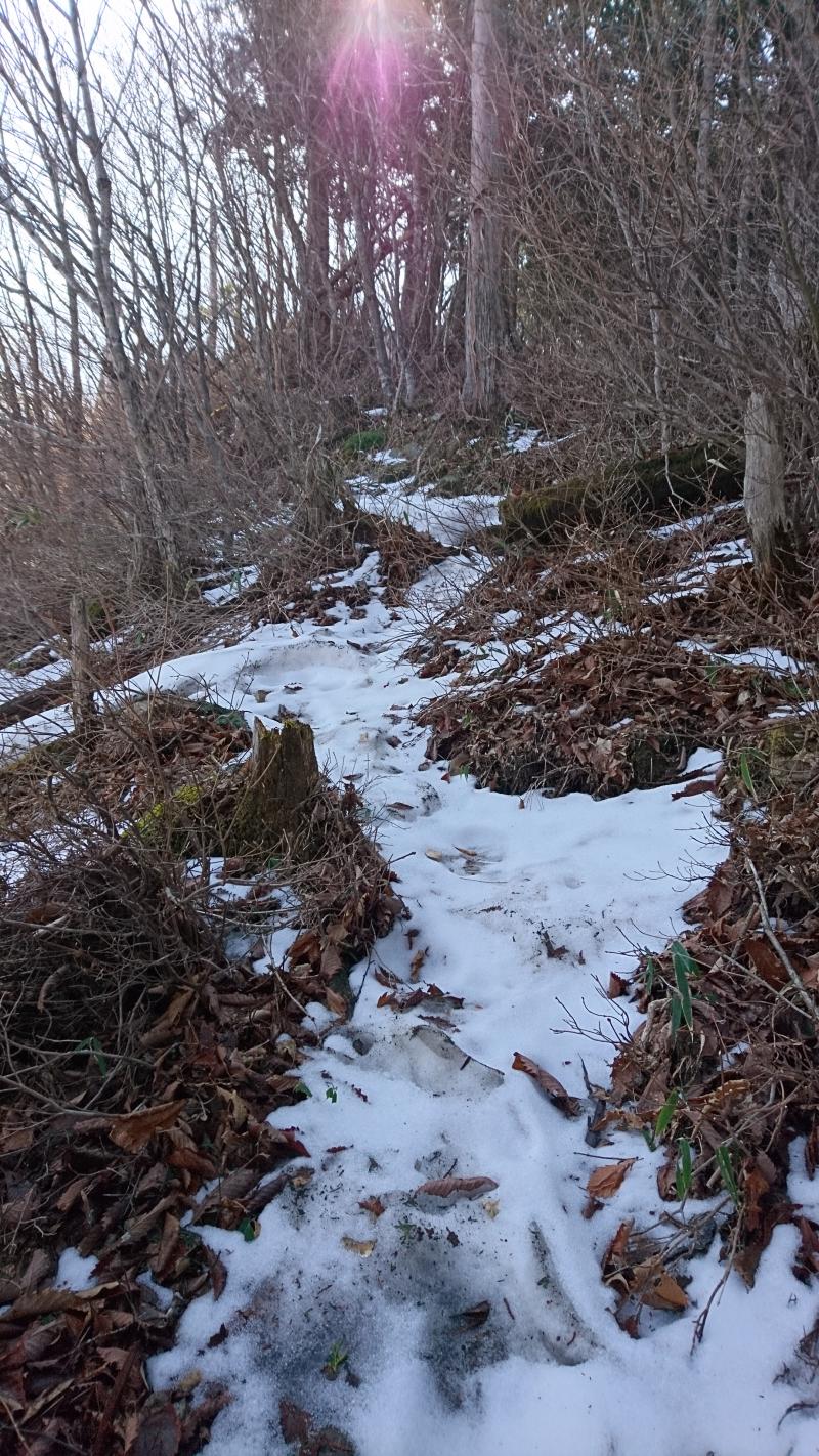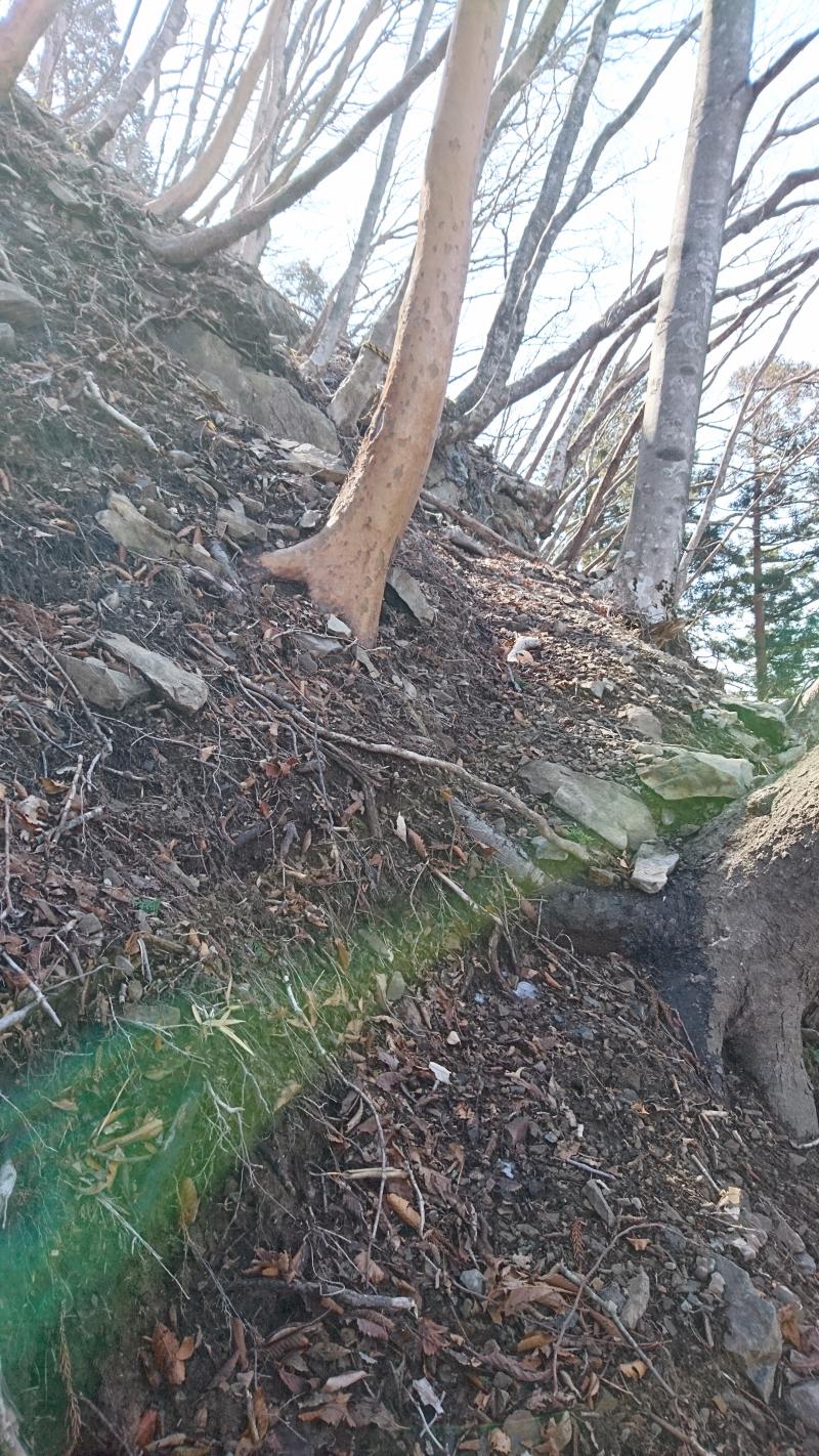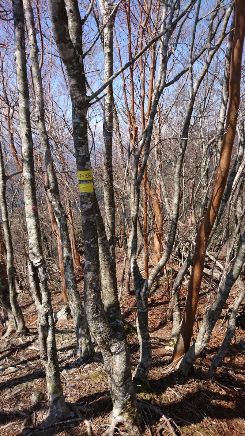 登頂後は周遊コースへ。ここは昔の地図にしかルートが載っていませんが、所々に先人が残したであろうピンクテープが有ります。基本は稜線伝いに歩いて行きますが、尾根筋を間違えると帰れなくなるので、GPSや地図を頼りに歩いて下さい。777mから登山口への下りがとても分かりにくいです。実際迷ってしまい、藪漕ぎをしながらの下山となりました。