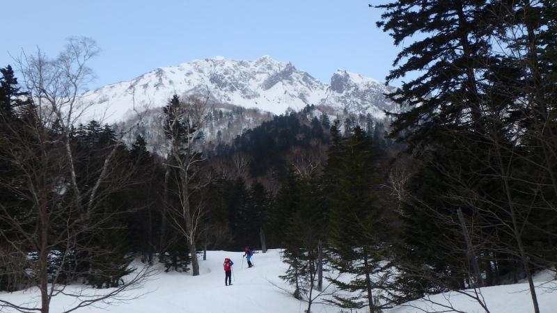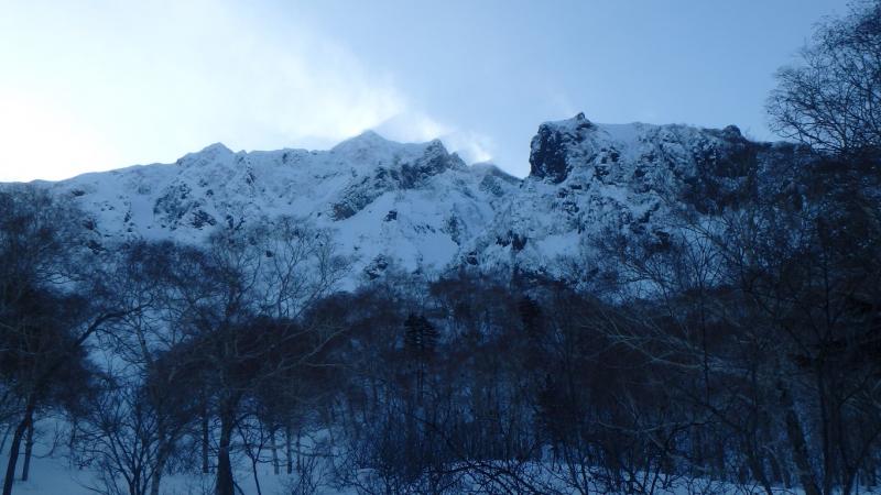朝から快晴。まずは幌加ダムから林道を3時間半。気温はポカポカと春の陽気ですぐに汗だく。幌加川出合いからはニペソツ東壁目指し沢沿いにルートを取る。幾度かの渡渉があるもののスノーブリッジがかかっており、さほど苦労はしないが緩んだ雪にスノーシューでも時折膝近くまで潜り消耗が激しい。1300過ぎいよいよ正面に迫力ある東壁の全容が目の前に。絶好のロケーションのテン場となった。