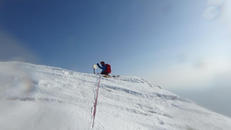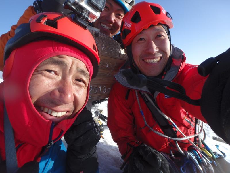 核心部は短いながらも被り気味の凹角。ずば抜けた突破力をもつメンバーが見事に突破。見ているこちらも緊張した。ここから傾斜の落ちた雪稜をさらに2ピッチでようやく頂上。8時間半のクライミングは今季一番の達成感。