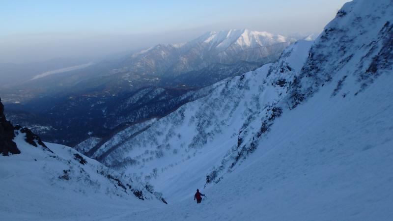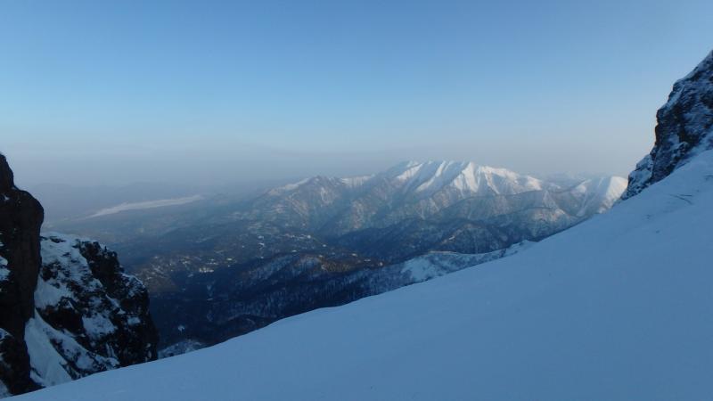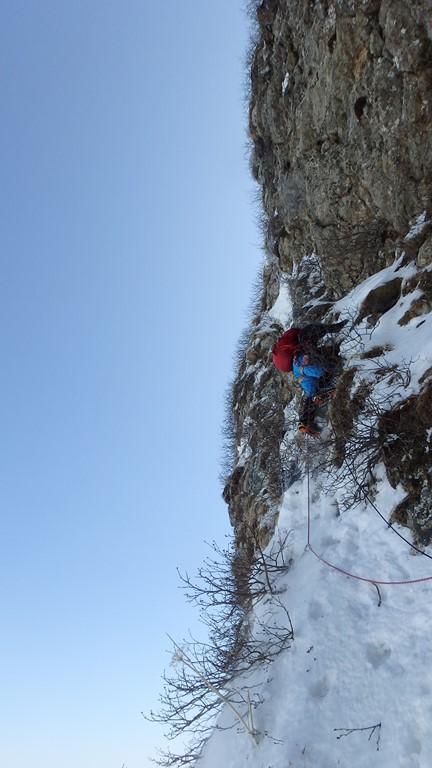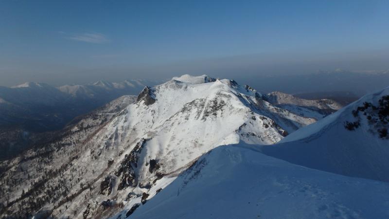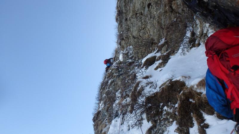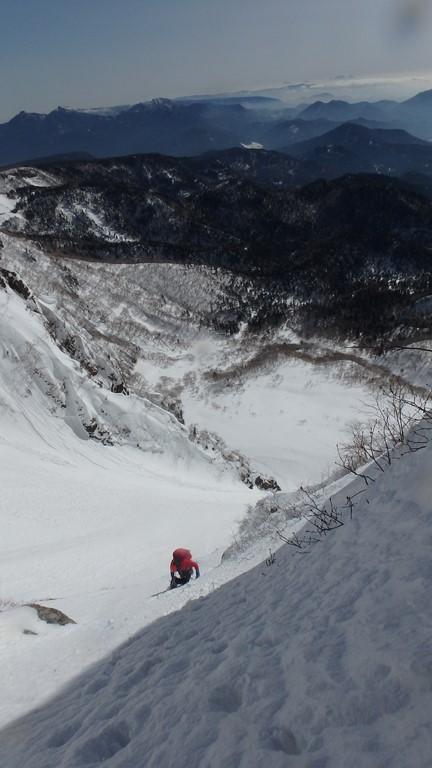 中央リッジは急峻な雪稜からはじまる。メンバーでルートを相談しながら少しずつ高度を上げる。あまり記録のないルートなので慎重に成らざるを得ない。足元はやや固めの雪板の下はグラニュー糖のような固まらない雪質。時間の割には高度は上がらず体力ばかり消耗する。雪稜途中からロープを出し、2ピッチで核心へ。ここで残置があり、自分たちのルート取りが正しいことに安心する。