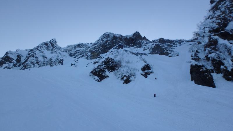 いよいよ東壁登攀へ。前夜はなかなかの緊張感で全く眠れず・・ということはなく、しっかり爆睡。本日は前日よりもさらに好天でさらに風もほとんどない。中央リッジ取り付きまではとにかく雪崩に注意。ここは気温が高い時には入り込みたくないところ。