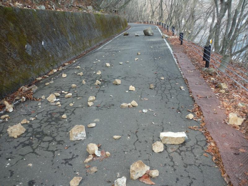 車道には落石が多く、この時期はまだ車両通行止めです。
