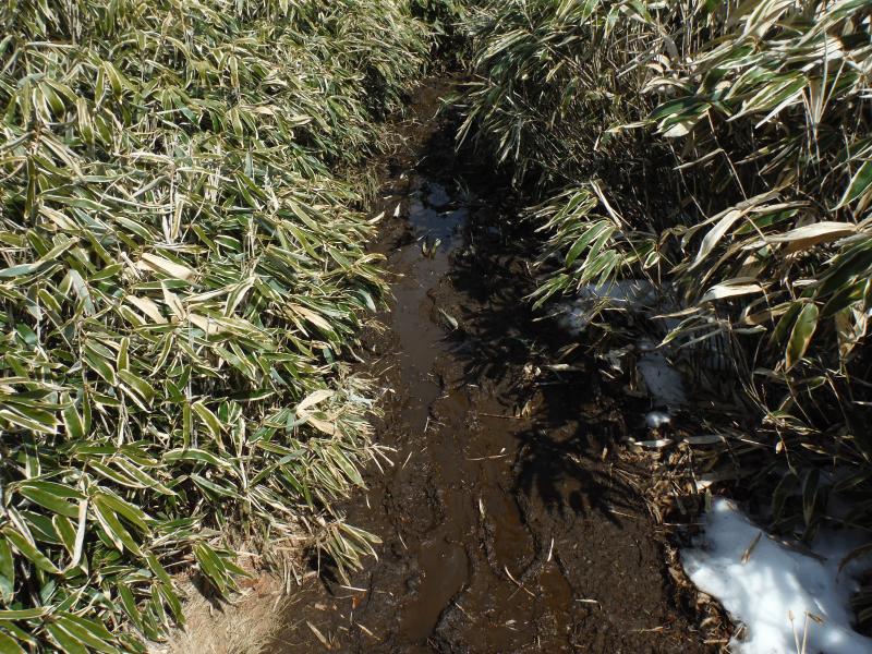 頂上から帰りの尾根道は雪が解けてドロドロでした。