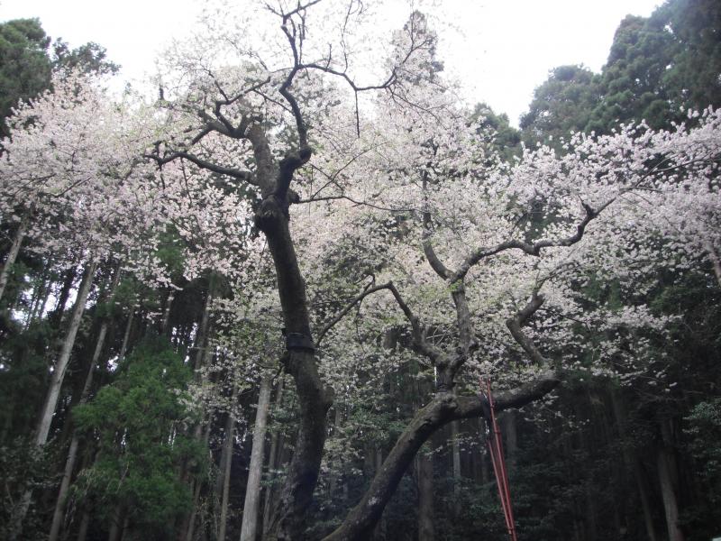 白糸の滝コースはなかなかの急登。滑りやすいところもありますが、ミツバツツジに癒されつつ慎重に登っていきます。分岐から「後でこれ登るのか…」というくらい降ると今回の本命、虎尾桜!樹齢600年のエドヒガンという種類だそうです。葉が出始めてていましたが立派な桜でした。虎尾桜を守っている地元の方々に頭が下がります。