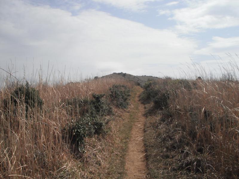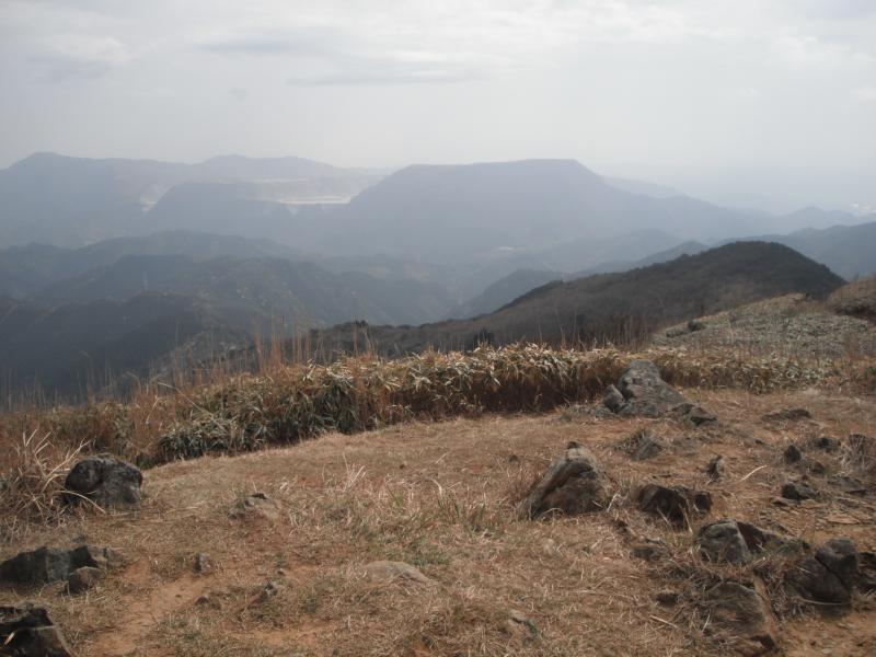 ひいこら言って登山道に戻り、急登を登っていくと、ぽっかり空が開けます。山頂付近は草原状になっていて、気持ちの良い場所です。山頂からは尺岳方面や牛斬山方面の縦走路や石灰採取で平らになった香春岳一ノ岳が見渡せました。