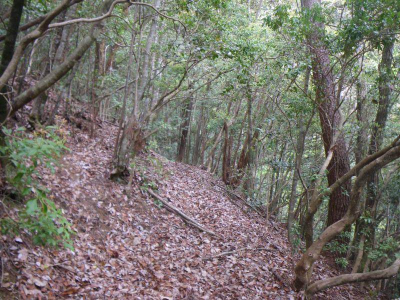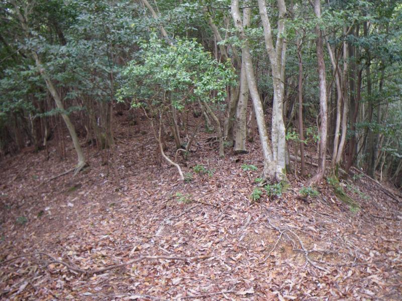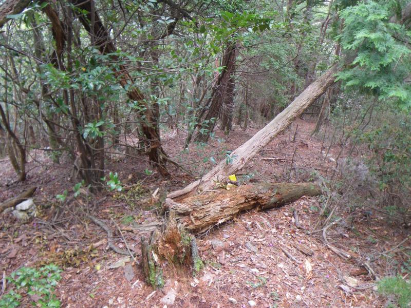 ④P308からしばらくで尾根上から右トラバースに進みます、その後で道が落ち葉の為に不明瞭になりますが、トラバースし続けると小沢が出てきて、超えてから右上します。すると道がはっきりして、尾根にのります