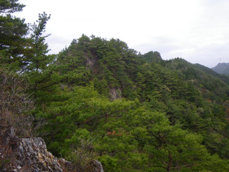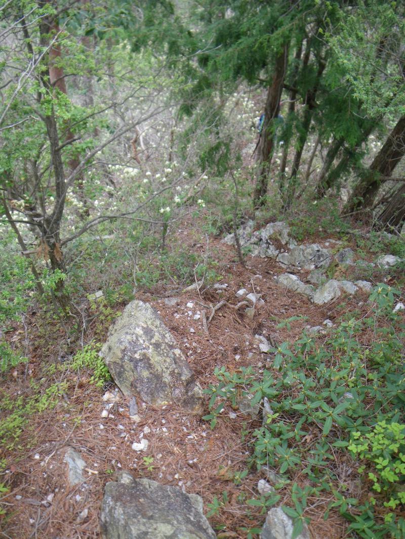 この山の山頂近くには岩峰群があり、尾根は細いジグザグ調ですが、見た目より厳しい箇所はありません。春先は納古山同様、ミツバツツジ・ヒカゲツツジ・アカヤシオが登山道沿いに咲きます。今年は花も早く、アカヤシオはやはり先週が見頃のようで週末の雨で散ったのが多かったです。