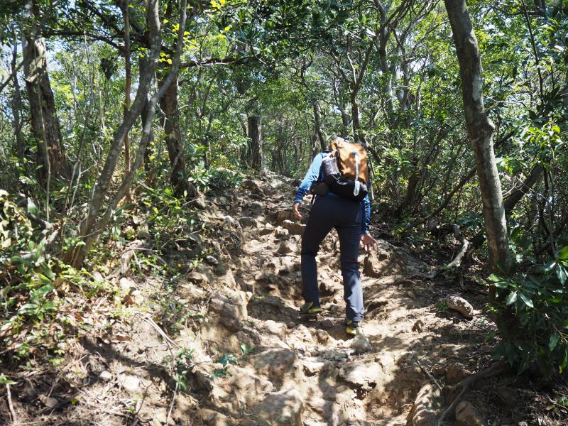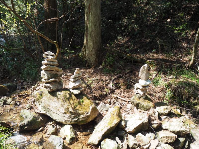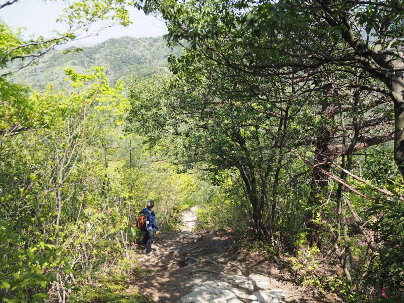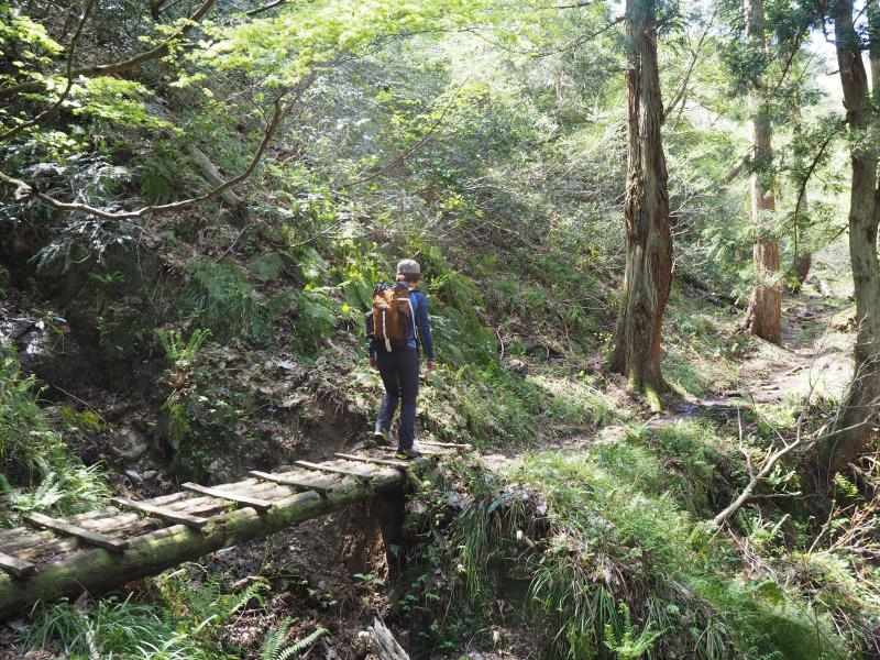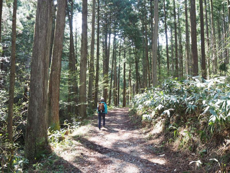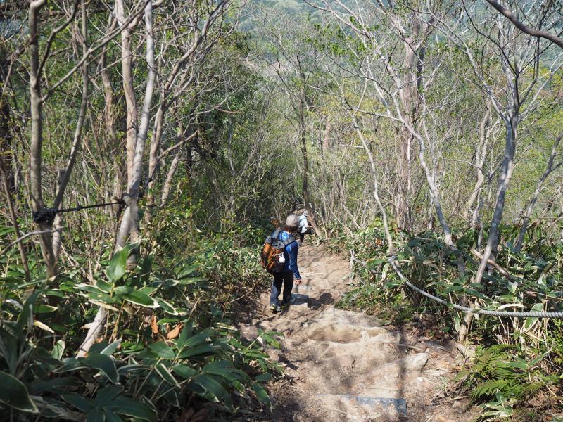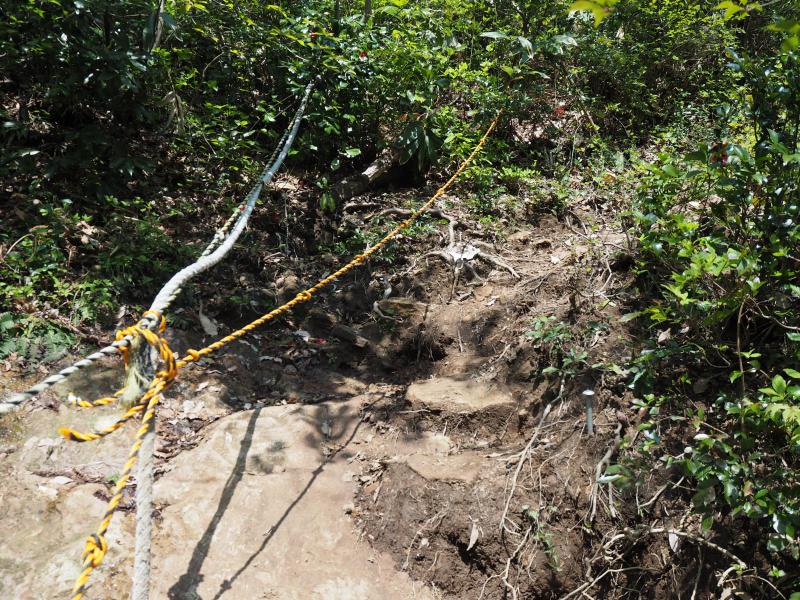 今日は登りに中ノ谷散策路を使いました。しばらくのんびりした林道歩きのあと緩やかに登りが始まります。しばらくは川沿いを進み何回か川をまたぎます。行者岩を過ぎるころつづら折りの急登が始まります。ロープが設置されてるところもあったり意外にキツイ登りです。