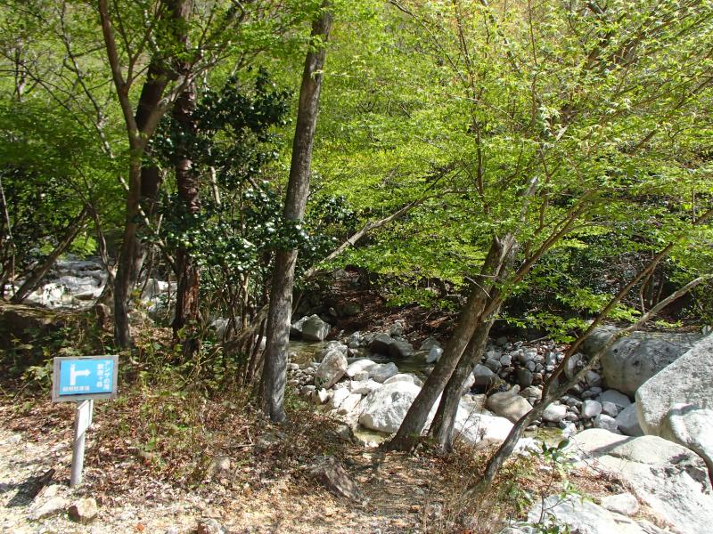 ・山道を少し歩くと沢沿いに歩くコースに。ガレた道を進みます。広々としたコースは歩いていて気持ちがいいのですがやや単調。ちょっと面白い箇所もありますが三段の滝を越えるまではあまり変化はありません。