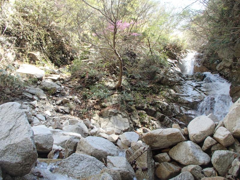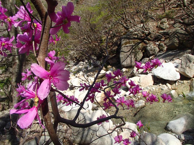 ・結局、時間的な問題もあり泣く泣く下山する事に。根の平峠を左にコース取りし、登山道を下っていくと沢沿いのコースになっていきます。ここで!やっと念願のアカヤシオが!!花が咲いている樹は少ないですが、沢沿いの白い河原にアカヤシオが映えます。あぁ、こっちに下っていてよかったぁ~。