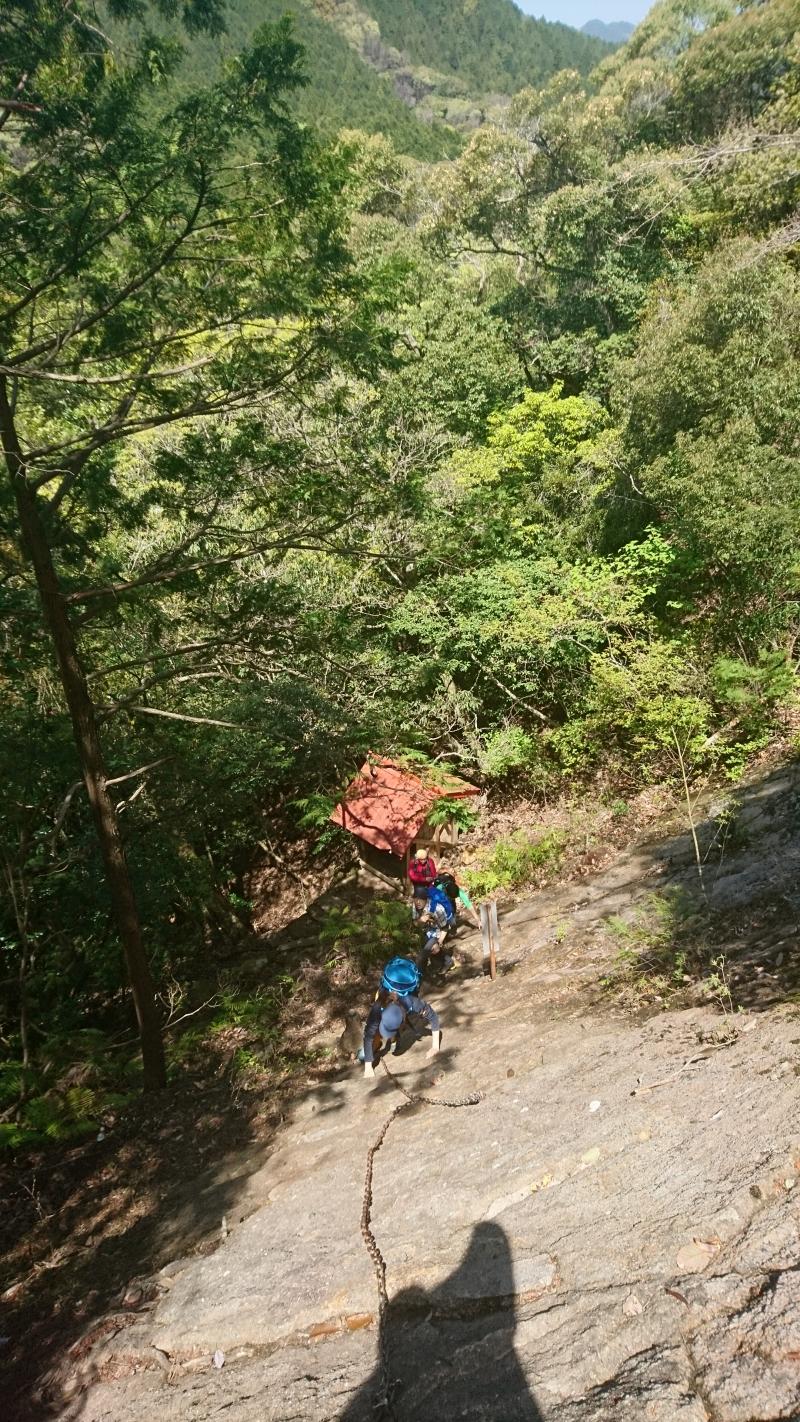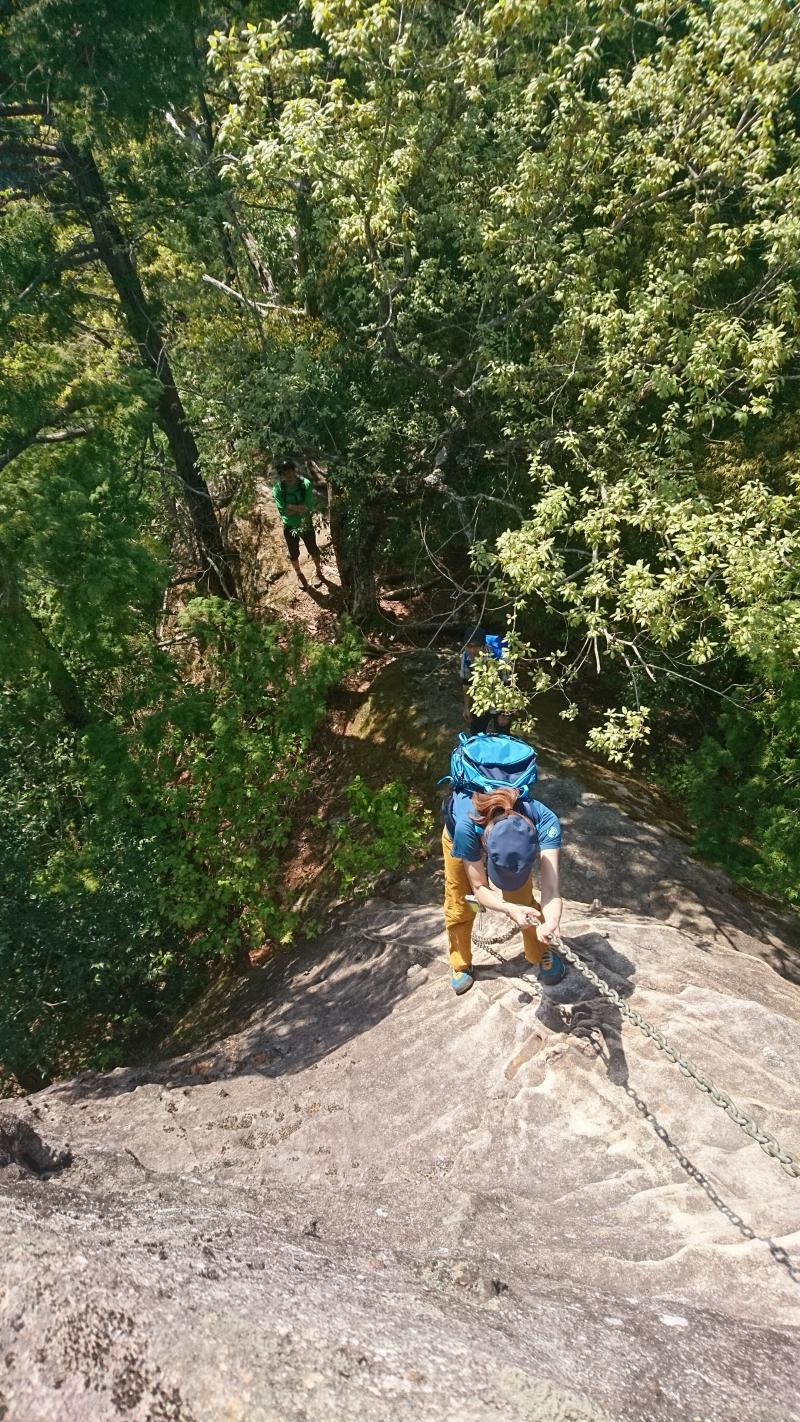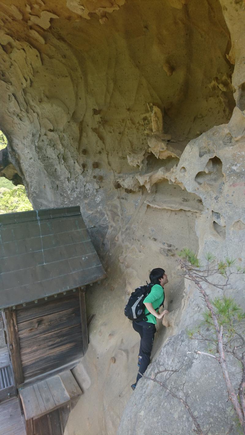 お堂に参ってから、お堂の横にある鐘掛の垂壁を登ります。ややクライミング要素がありますが、足場や手がかりはしっかりあるので、慎重に行けば大丈夫かと思います。