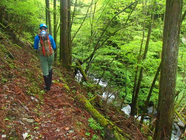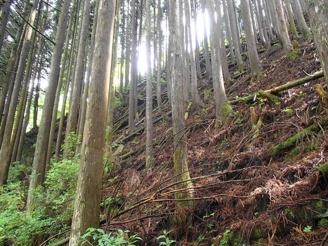 間違えた支尾根をそのまま降りてみようということになり、なんとなく歩いた尾根は下部の傾斜がきつく地形図を眺めて弱点を探しながらの下降なので説明できません。地形図のある木梶側の左岸の作業道を見つける事ができると少し楽できました。
