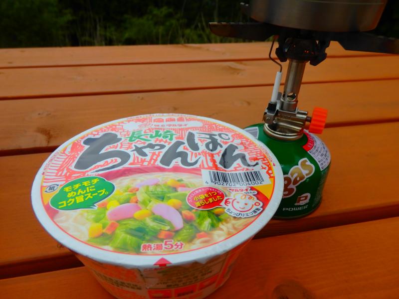 大坂山の山頂にあるテーブルに戻って、念願のカップ麺。