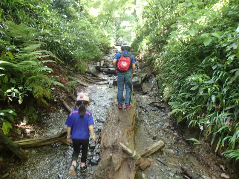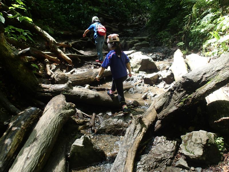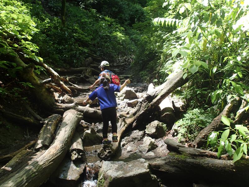 とび石の辺りは沢の中を歩きます。前日の大雨でも特に増水も無く、大きな石や倒木を伝って歩きます。油断するとスリップするので注意。子供でも楽しめる程度ではありますが、やはり下りより登りで使いたいコースと言えるでしょう。恐らくあまりないのでしょうが、万一増水していても、飛び石の直前で稲荷山コースに直登する逃げ道もあるので大丈夫でしょう。