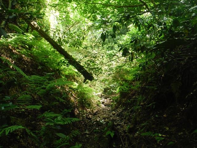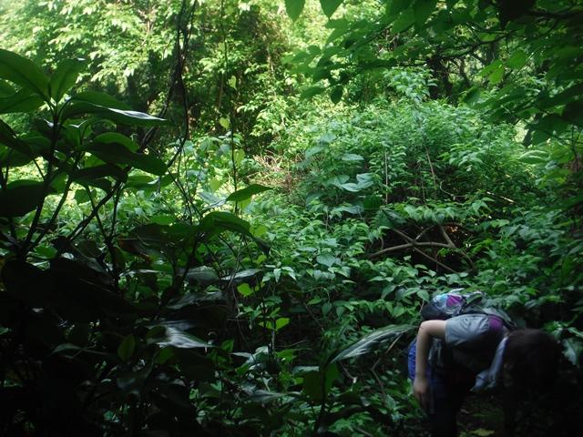 直登コースは超マイナーコースで薮っぽい急斜面を150m程登ることになります。取付くと、踏み跡はあるものの時期的に緑が増え、大分薮っぽくなってきました。
