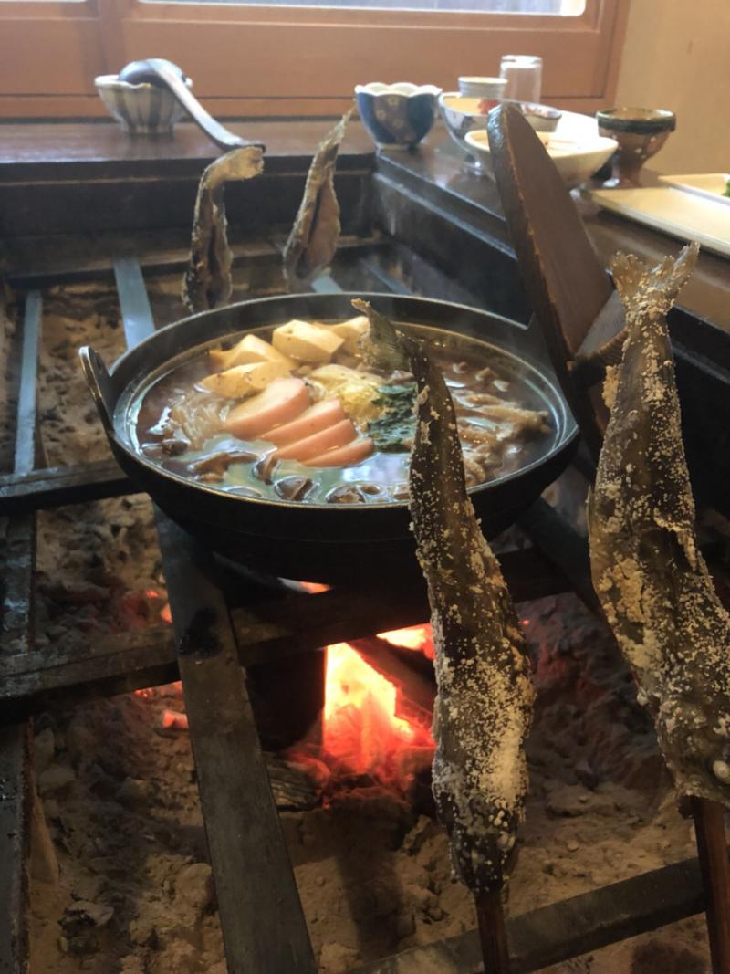 ここで食べるまでウドがあんなに透明感のある味だとは知らなかったです。目の前の囲炉裏で焼かれた岩魚を頭から齧ったり、素材以外よけいなものが入っていない猪鍋の出汁を味わったりしていると、すっと1日の疲れが抜けていくような気持ちになります。