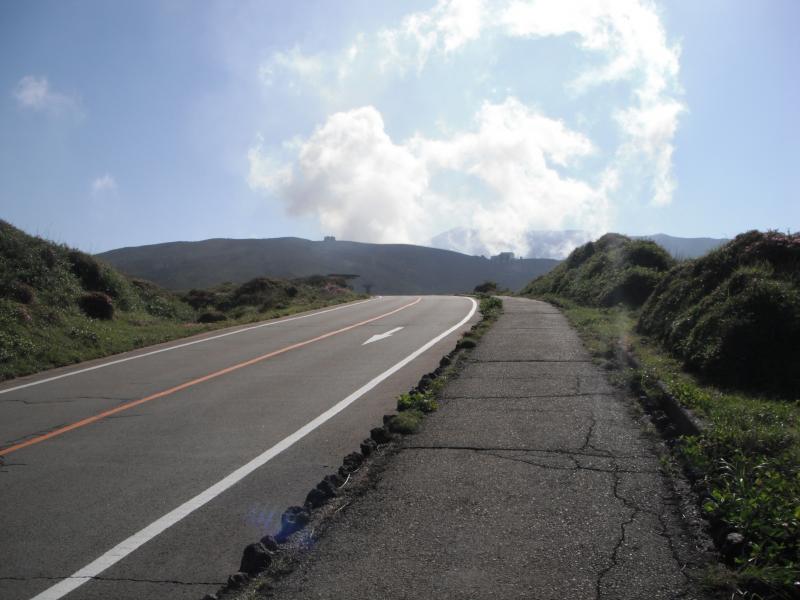 公園道路の脇の歩道を登って行きます。見上げると火口からもくもくと噴煙が上がっているのが見えます。九重の硫黄山も噴煙を出していますが、阿蘇の方がヤバさは上のような気がしました。