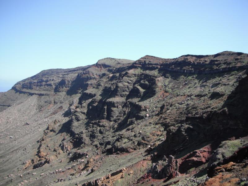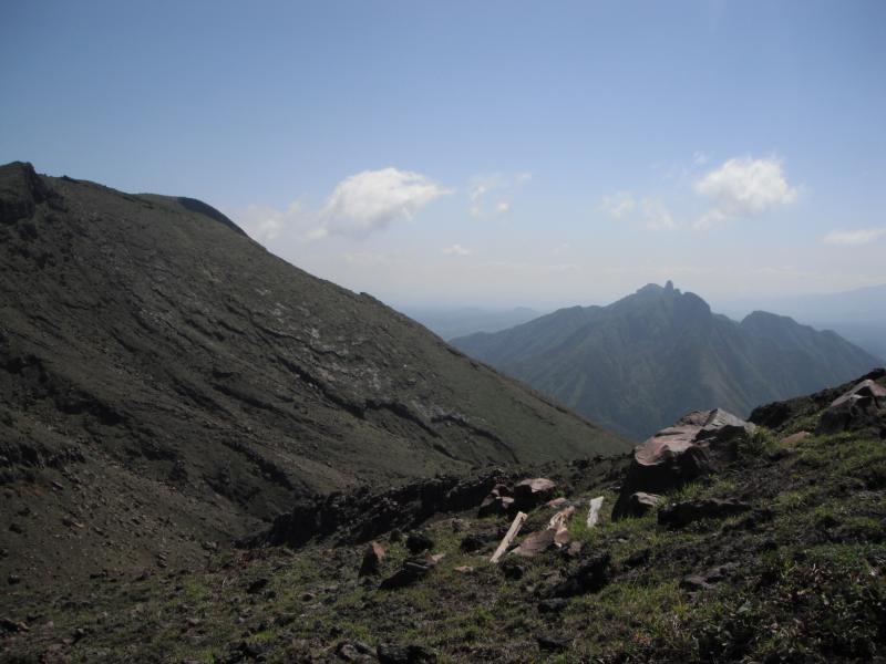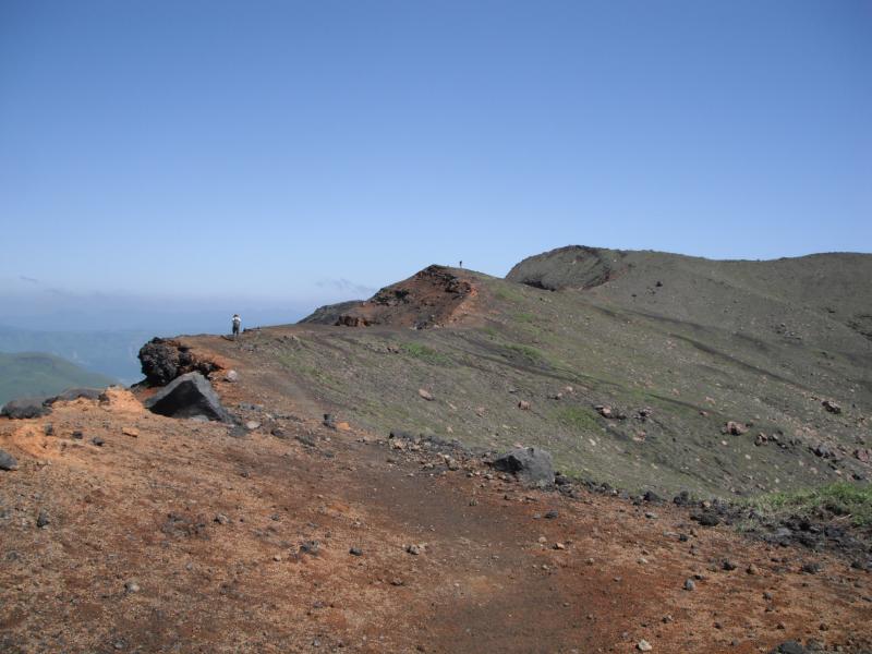 まるで火星のような砂千里ヶ浜を越え、がれた急登に取り付きます。この登りがきつい!ひいこら登りきると、快晴の稜線歩き!まるで森林限界を超えたような景色です。大したアップダウンもなく中岳、そして最高峰の高岳に到着。