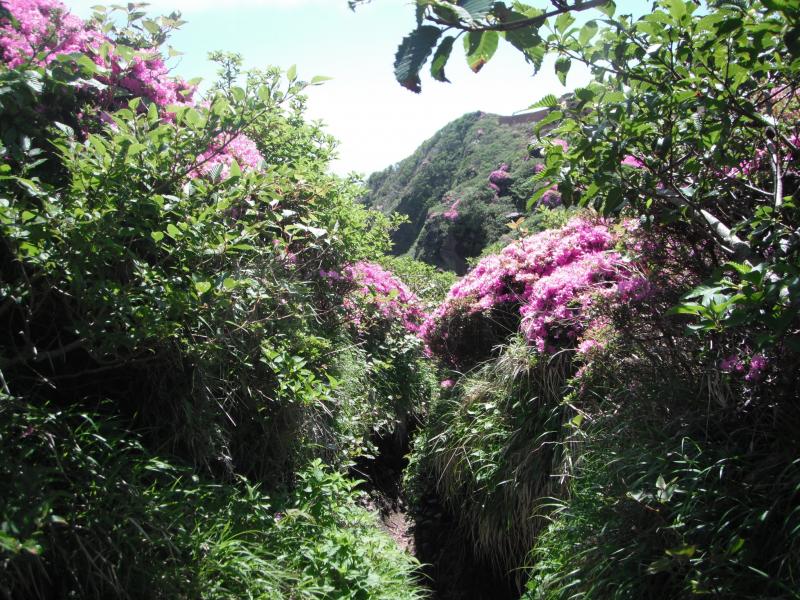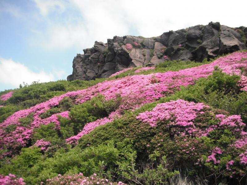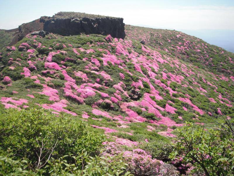 ここからがすごかった!高岳東峰の南側斜面はびっしりとピンク色!ミヤマキリシマです!間に合いました!右を見ても左を見てもミヤマキリシマ!月見小屋に下っていくと、斜面を一望でき、素晴らしい景色でした。大満足の山行となりました!