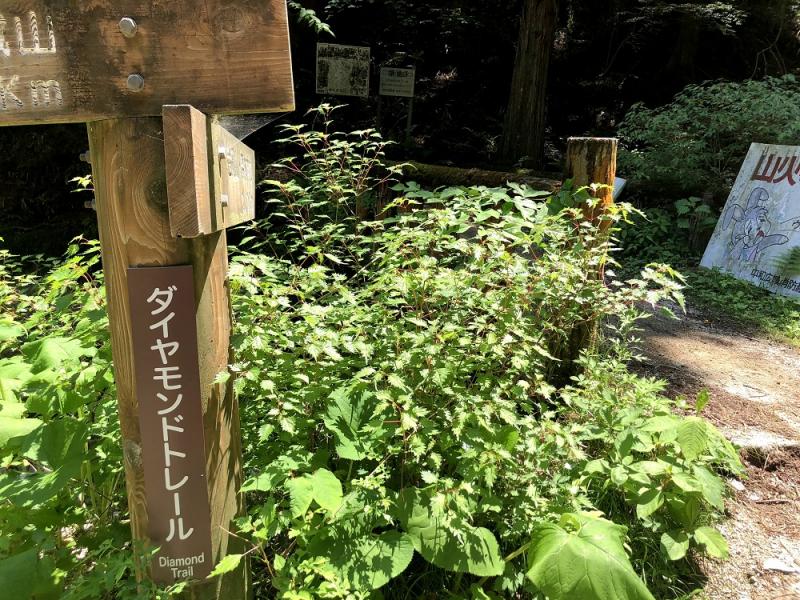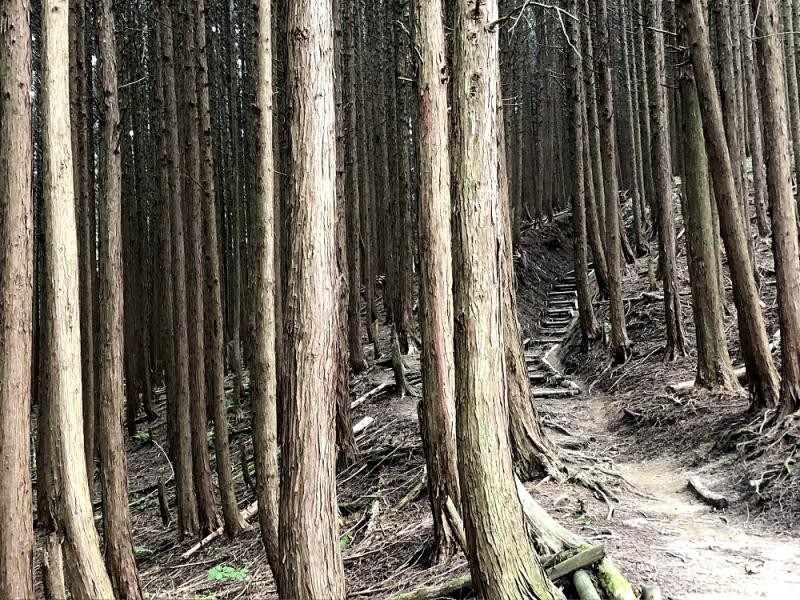 コースタイム1時間弱の砂利道を歩き、左手の橋を渡って山の中へ。ここ一帯が林業地となっており、ほどよく日の当たる間引かれた森の中を歩きます。上の方の杉林は、なにか異様?良い?な雰囲気で、今回のコースの中では一番印象が残りました。頂上は、たくさんの人で賑わっていました。