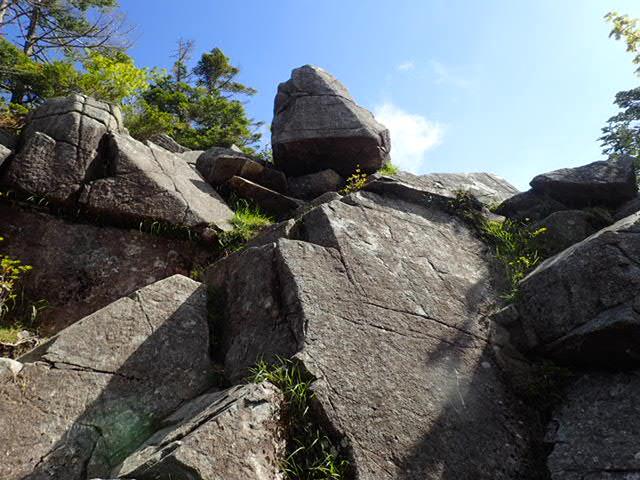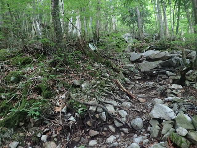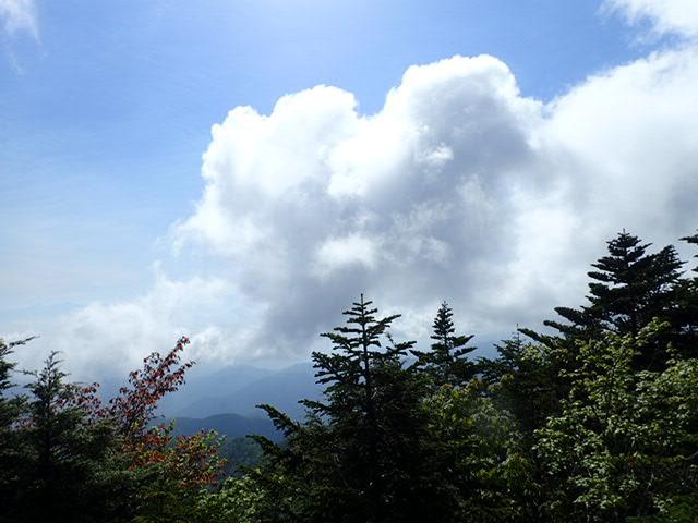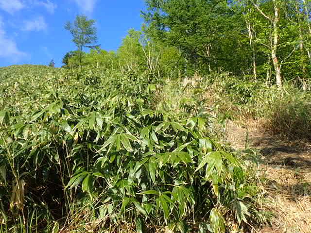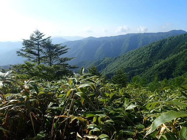 この道、丸太梯子が何ヶ所も出てくる。ペースが掴みづらい。ヒィヒィ言って登ると、クマ笹が出て来て、視界も開けることが多くなった。クマ笹の切れ口を見るに、どうやら刈り取ってくれているらしい。展望は少ないと伺っていたので有り難いことだ。お陰で、気持ちの良い尾根だった。焼山と思しき山が見えた。何というか、夏山チックだ。