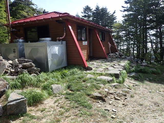 9/10からが長く感じたが、踏ん張って歩く。展望櫓がある山頂へ到着した。誰も居ない。ちょっと歩いた先の避難小屋へ行ってみることにした。