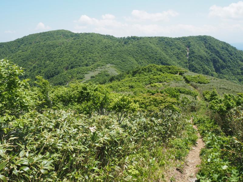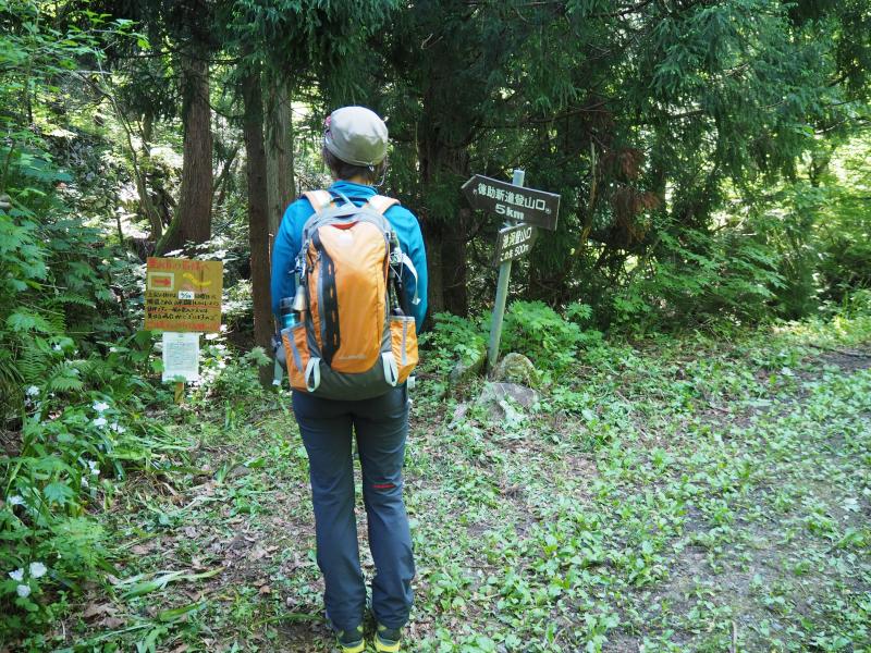 さぁ無事スタート。まずは池洞新道へ。いきなり急登が始まる。まだ動き出していないカラダには結構堪える。息があがり汗がしたたり落ち始めしばらくすると平坦な道に。らくちん気分で進むと中俣谷覗の看板に。地図を見てもうここまで来たんだ、いいんじゃない?なんて思ったのは大きな勘違い。この先、ひたすらダラダラ延々と続く嫌らしい(笑)登り坂に妻はだんだんと口数が少なくなってくる。急登ではないがとにかく登り続けるのだ。ようやく登りつめると突然笹原に飛び出す。ここが加賀甲だ。いきなり視界が開け大展望が広がる。残念ながら白山は雲の中だが、これから進む先にしっかりとそしてどどーーんと大日山が構えている。