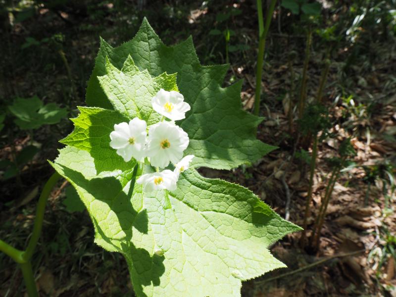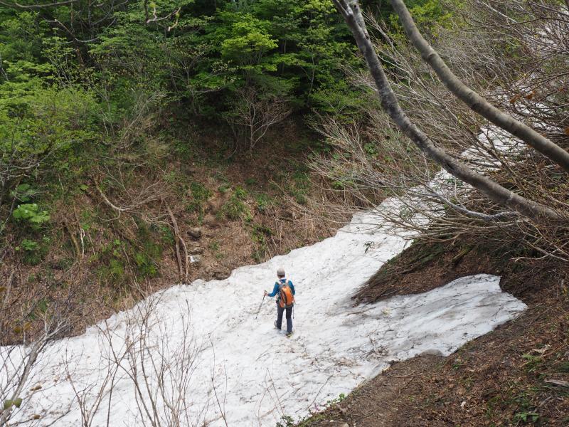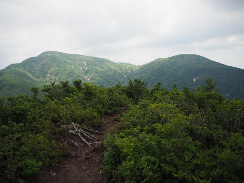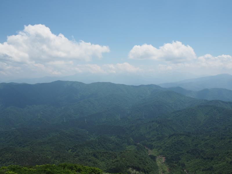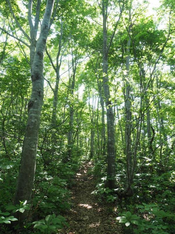 一旦カタクリの群生が語源となったカタコガ原に下りまだ雪の残る登山道を2度通過するとまたもやだらだらとした登りが始まる。木々の高さが低く空が近いのでもうそろそろ山頂なのでは?と期待させる風景(と私は思っている)が続き、でもなかなか着かない山頂にちょっと滅入る。と、本にあった越前甲の分岐を見つけられないまま山頂に着いた。あらら。山頂は広くここからも白山をはじめ荒島岳など石川県や福井県の山々の眺めがいい。
