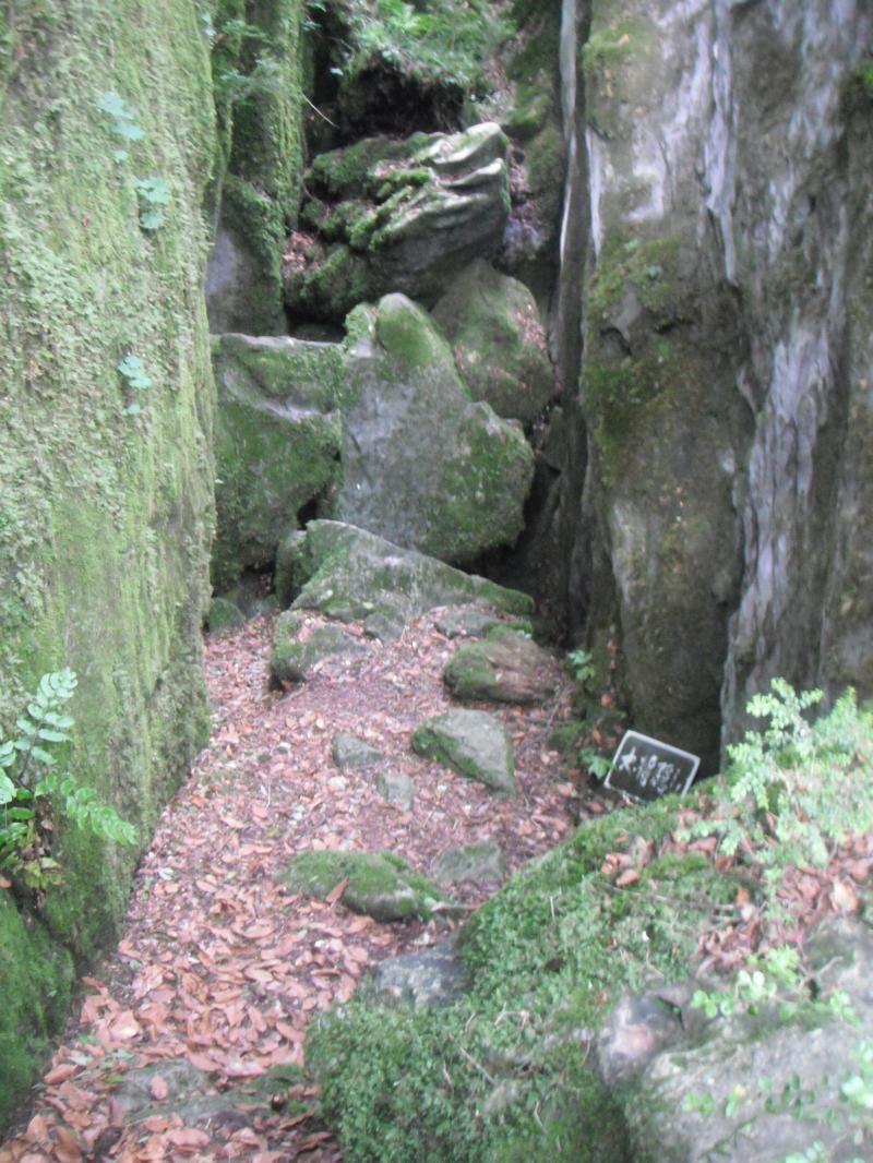 いきなりの急登!赤テープを頼りに登っていきます。時折現れるロープ場をこなしつつ、上部のクサリ場へ。結構な急傾斜に苦戦しました。さすが山岳宗教の山!稜線直下には「奥ノ院」「大将隠し」という岩の空間があります。大将とは戦国時代までこの辺を治めていた秋月氏の殿さまのことだそうです。