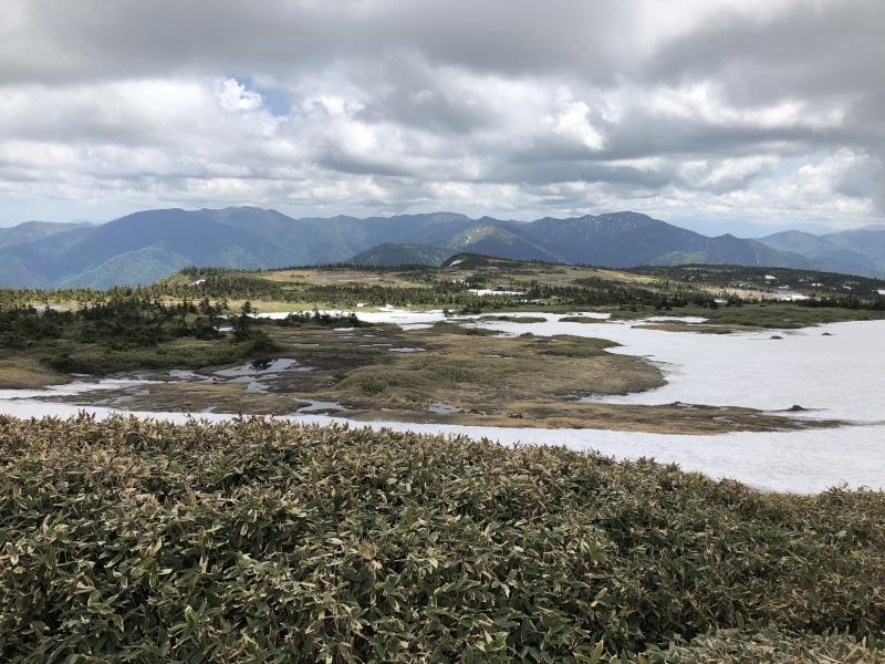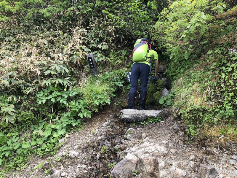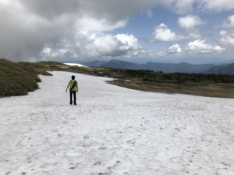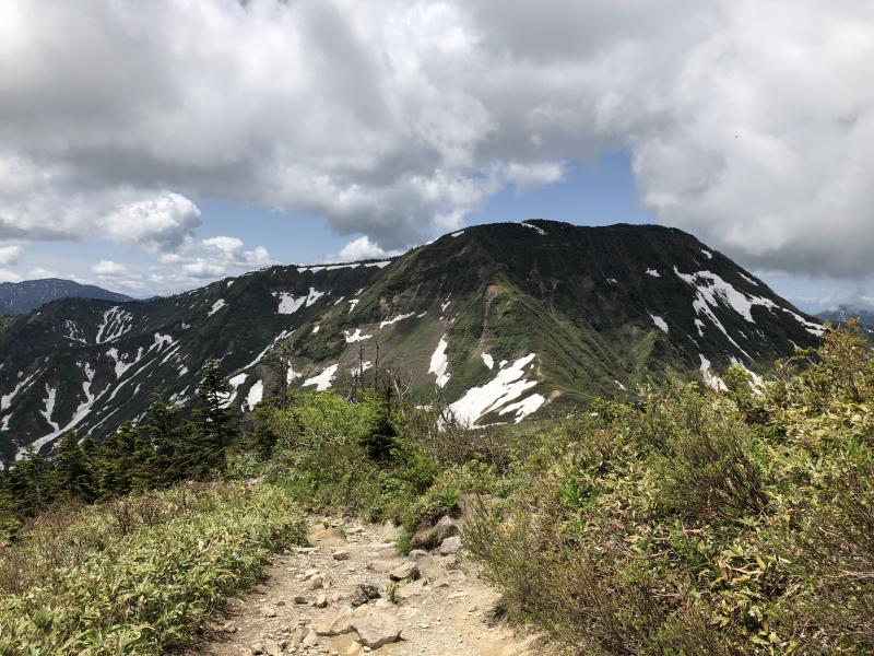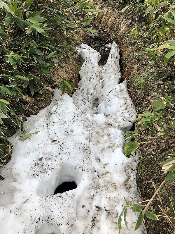 - 雪解けが進み、水分たっぷりの登山道ですので防水性の高いシューズは必須です。下之芝以降、残雪が出て来ます。この日はお天気も良かったのでピンクテープがはっきり見えましたが、曇天の日などは、残雪上ルートはしっかり確認した方が良さそうです。また、軽アイゼンを持参。使用しませんでしたが、雪上歩行に不安のある方は使用した方がお勧めです。踏み抜きも多いのでケガにご注意ください!
