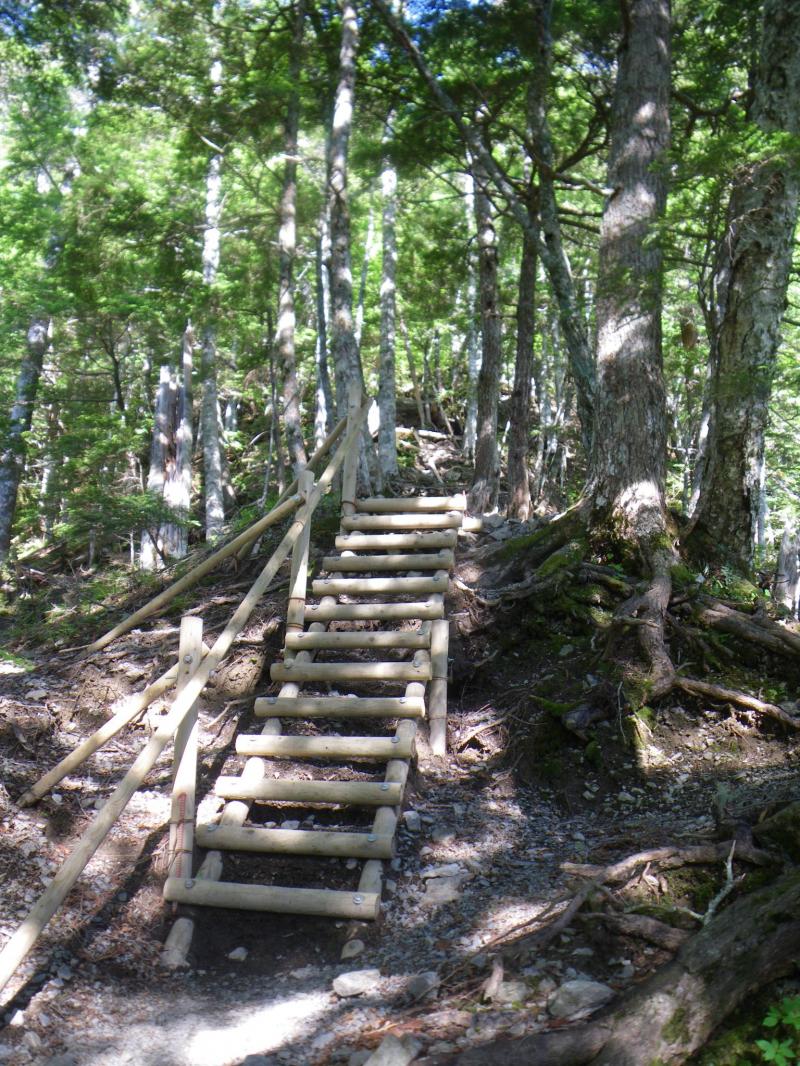 ⑤白根御池小屋までの樹林帯コースはいきなり急登で丸い丸太階段が数箇所あります