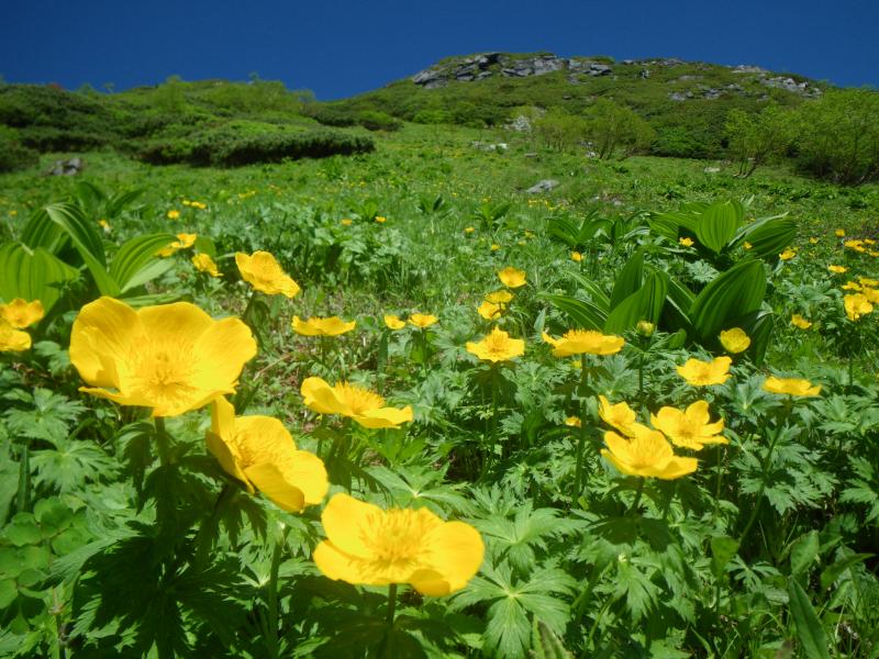 ⑥草すべり下部はイチリンソウ・ニリンソウが咲き乱れ、上部のお花畑にはシナノキンバイがたくさん咲いていました