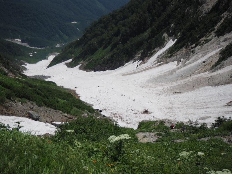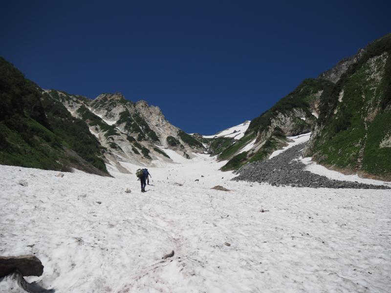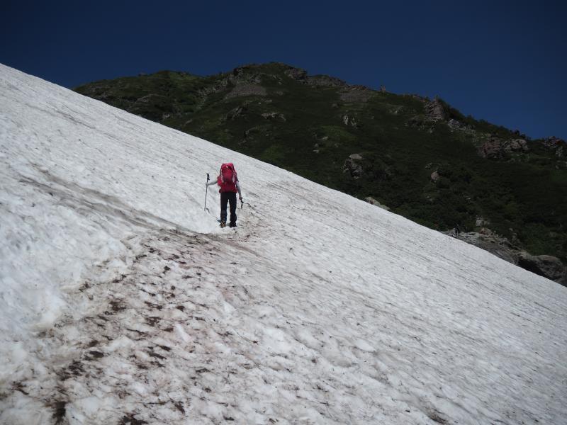 - 白馬大雪渓&小雪渓:例年通りの積雪量。軽アイゼン必須。落石の音が時たま聞こえてくる。雪渓上にも大小の石がたくさんある。雪渓上では休憩はとらないほうがベター。踏み跡はそれないように雪渓の中心を登っていくこと。小雪渓は雪斜面のトラバース。谷川にはストックは突かないようにし、足場をしっかり安定させながら進む。すれ違いはできないので反対側からの登山者と譲り合って渡る。