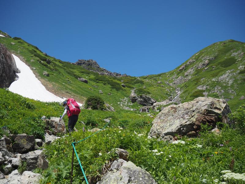 あの時は天気に泣いたが今日は快晴!空の青と雪渓の白、そして山々。ガスっていると数メートル先も見えない大雪渓だが、今回は視界良好。途中左斜面から大きめの落石。妻曰く「あのまま真っすぐ落ちてきたら直撃だと思った!」らしいが雪渓に乗ると方向を変えて砕けながら下部へ。とにかく登っている間カラカラと落石の音が続いた。雪渓上には大小の石がゴロゴロ点在。ゆえに赤ライン上(踏み跡上)を進み、途中休憩はせず、すみやかに大雪渓を通過する。ヘルメットを装着している登山者も意外と多く、浸透してきているのを感じる。大雪渓後一旦アイゼンを外すが少し登った小雪渓のトラバースでも装着は必須(と案内板あり)。すれ違いができないので反対側から来る登山者と譲り合って進む。その後はひたすら岩場の登りだ。最後にながーーーーい階段が出てくるが、ちょうどお花畑も広がってくるので花々で気を紛らわせ(笑)登る。